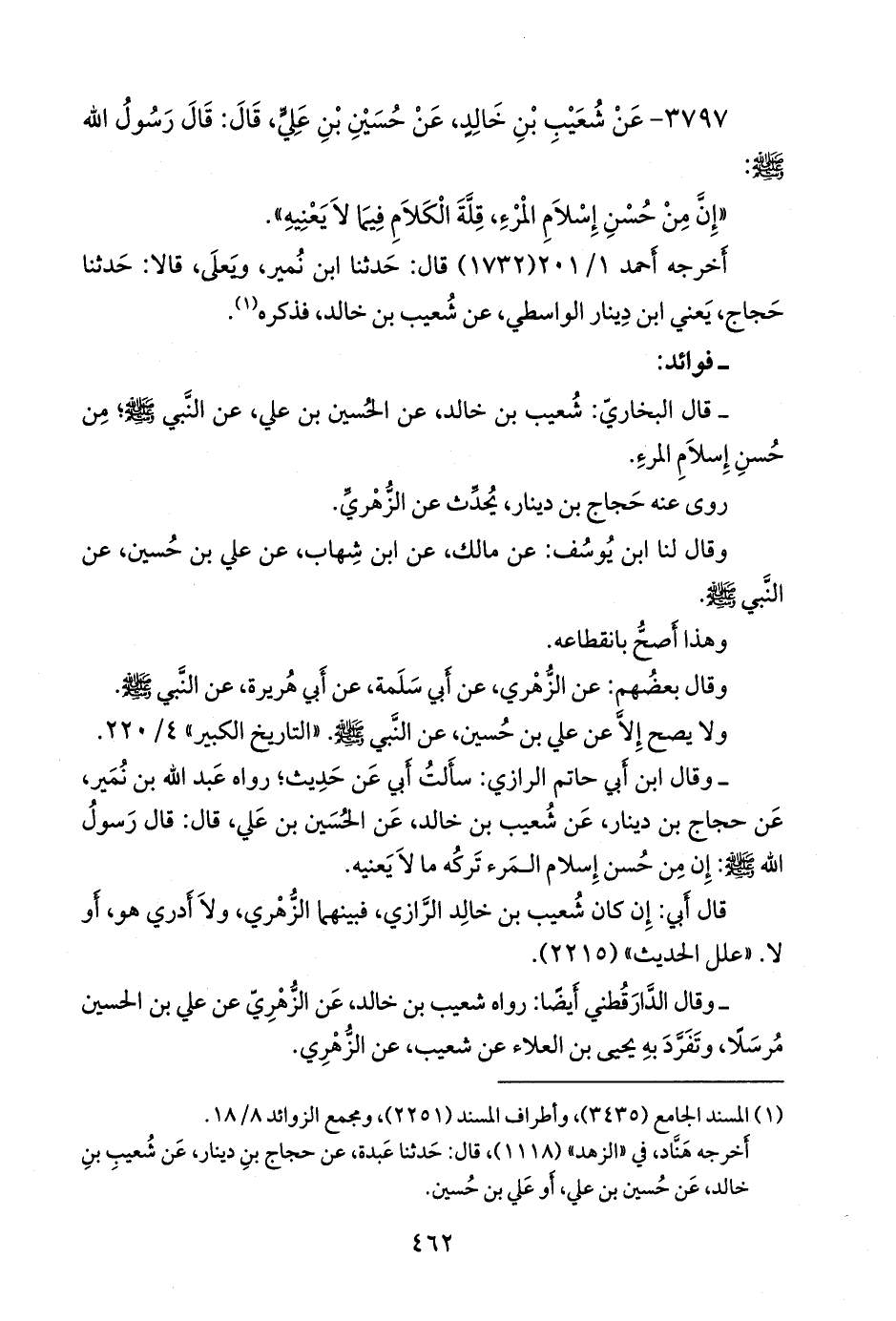 - وقال ابن أبي حاتم الرازي: سألتُ أبي عن حديثٍ؛ رواه عبد الله بن نُمير، عن حجاج بن دينار، عن شعيب بن خالد، عن الحسين بن علي، قال: قال رسول الله صَلى الله عَليه وسَلم: إن من حسن إسلام المرء تركه ما لا يعنيه.