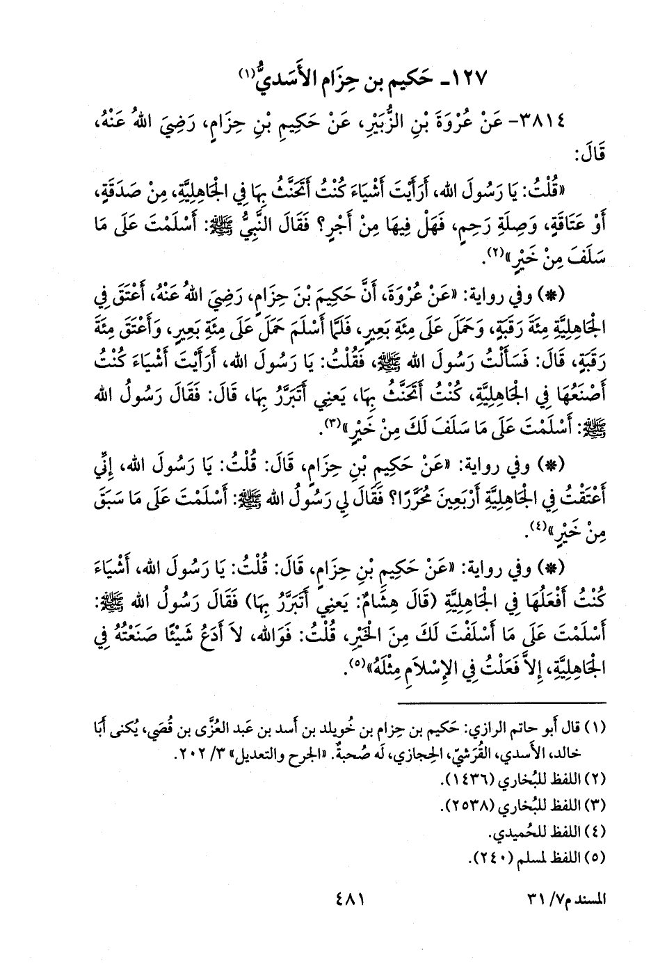 - وفي رواية: «عن حكيم بن حزام، قال: قلت: يا رسول الله، إني أعتقت في الجاهلية أربعين محررا؟ فقال لي رسول الله صَلى الله عَليه وسَلم: أسلمت على ما سبق من خير» (¬٤).