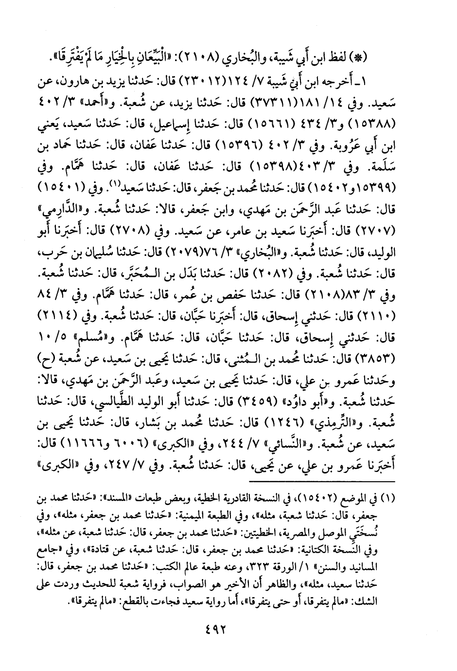 وفي (١٥٣٩٩ و ١٥٤٠٢) قال: حدثنا محمد بن جعفر، قال: حدثنا سعيد (¬١). وفي (١٥٤٠١) قال: حدثنا عبد الرَّحمَن بن مهدي، وابن جعفر، قالا: حدثنا شعبة. و «الدَّارِمي» (٢٧٠٧) قال: أخبرنا سعيد بن عامر، عن سعيد. وفي (٢٧٠٨) قال: أخبرنا أَبو الوليد، قال: حدثنا شعبة. و «البخاري» ٣/ ٥٨ (٢٠٧٩) قال: حدثنا سليمان بن حرب، قال: حدثنا شعبة. وفي (٢٠٨٢) قال: حدثنا بدل بن المحبر، قال: حدثنا شعبة. وفي ٣/ ٦٤ (٢١٠٨) قال: حدثنا حفص بن عمر، قال: حدثنا همام. وفي ٣/ ٦٤ (٢١١٠) قال: حدثني إسحاق، قال: أخبرنا حبان، قال: حدثنا شعبة. وفي (٢١١٤) قال: حدثني إسحاق، قال: حدثنا حبان، قال: حدثنا همام. و «مسلم» ٥/ ١٠ (٣٨٥٣) قال: حدثنا محمد بن المثنى، قال: حدثنا يحيى بن سعيد، عن شعبة (ح) وحدثنا عَمرو بن علي، قال: حدثنا يحيى بن سعيد، وعبد الرَّحمَن بن مهدي، قالا: حدثنا شعبة. و «أَبو داود» (٣٤٥٩) قال: حدثنا أَبو الوليد الطيالسي، قال: حدثنا شعبة. و «التِّرمِذي» (١٢٤٦) قال: حدثنا محمد بن بشار، قال: حدثنا يحيى بن سعيد، عن شعبة. و «النَّسَائي» ٧/ ٢٤٤، وفي «الكبرى» (٦٠٠٦ و ١١٦٦٦) قال: أخبرنا عَمرو بن علي، عن يحيى، قال: حدثنا شعبة. وفي ٧/ ٢٤٧، وفي «الكبرى»
