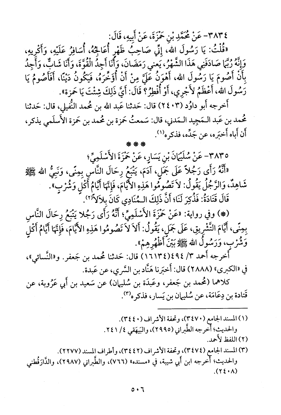 - وفي رواية: «عن حمزة الأسلمي؛ أنه رأى رجلا يتبع رحال الناس بمنى، أيام التشريق، على جمل، يقول: ألا لا تصوموا هذه الأيام، فإنها أيام أكل وشرب، ورسول الله صَلى الله عَليه وسَلم بين أظهرهم».