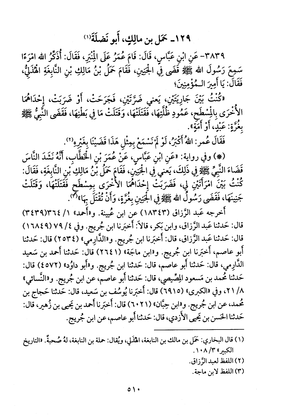 ٣٨٣٩ - عن عبد الله بن عباس، قال: قام عمر على المنبر، فقال: أذكر الله امرءا سمع رسول الله صَلى الله عَليه وسَلم قضى في الجنين، فقام حمل بن مالك بن النابغة الهذلي، فقال: يا أمير المؤمنين؛