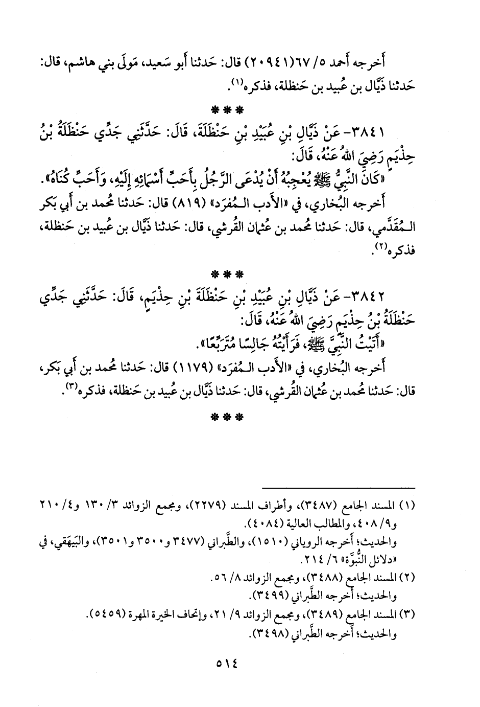 ٣٨٤٢ - عن ذيال بن عبيد بن حنظلة بن حذيم، قال: حدثني جدي حنظلة بن حذيم رضي الله عنه، قال: