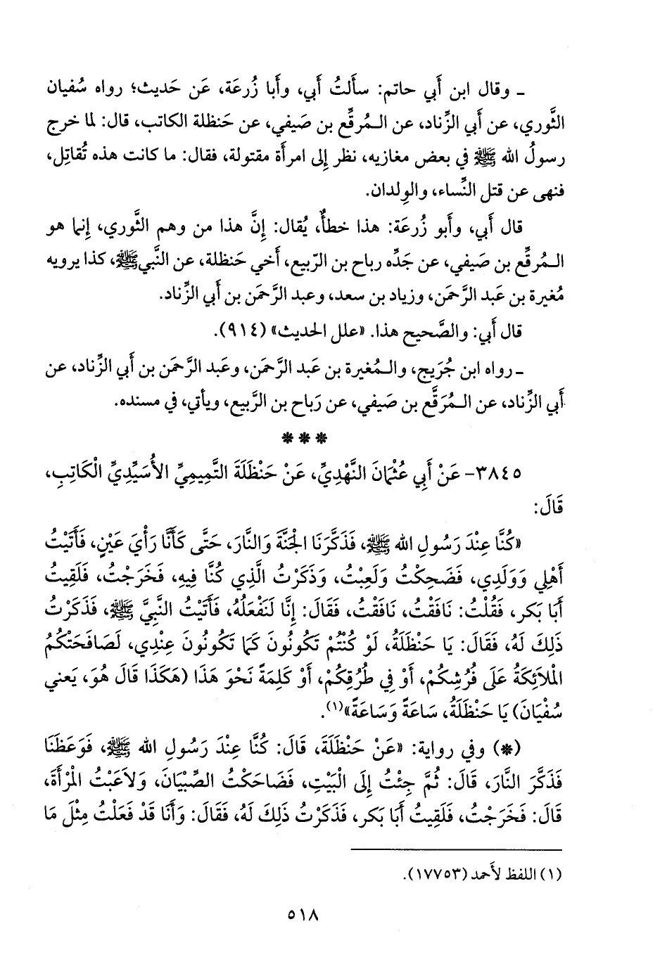 «كنا عند رسول الله صَلى الله عَليه وسَلم فذكرنا الجنة والنار، حتى كأنا رأي عين، فأتيت أهلي وولدي، فضحكت ولعبت، وذكرت الذي كنا فيه، فخرجت، فلقيت أبا بكر، فقلت: نافقت، نافقت، فقال: إنا لنفعله، فأتيت النبي صَلى الله عَليه وسَلم فذكرت ذلك له، فقال: يا حنظلة، لو كنتم تكونون كما تكونون عندي، لصافحتكم الملائكة على فرشكم، أو في طرقكم، أو كلمة نحو هذا (هكذا قال هو، يعني سفيان) يا حنظلة، ساعة وساعة» (¬١).