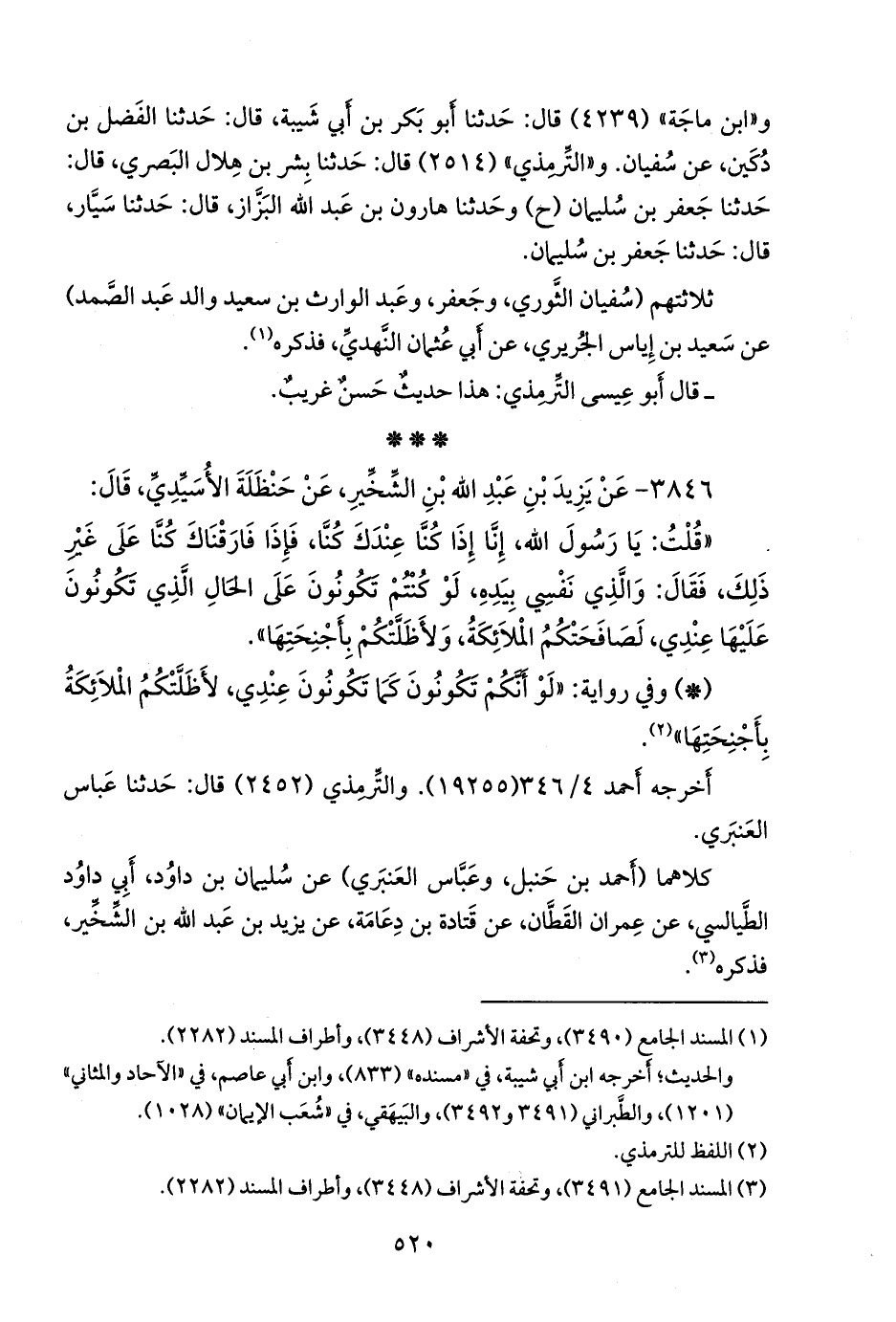 «قلت: يا رسول الله، إنا إذا كنا عندك كنا، فإذا فارقناك كنا على غير ذلك، فقال: والذي نفسي بيده، لو كنتم تكونون على الحال الذي تكونون عليها عندي، لصافحتكم الملائكة، ولأظلتكم بأجنحتها».