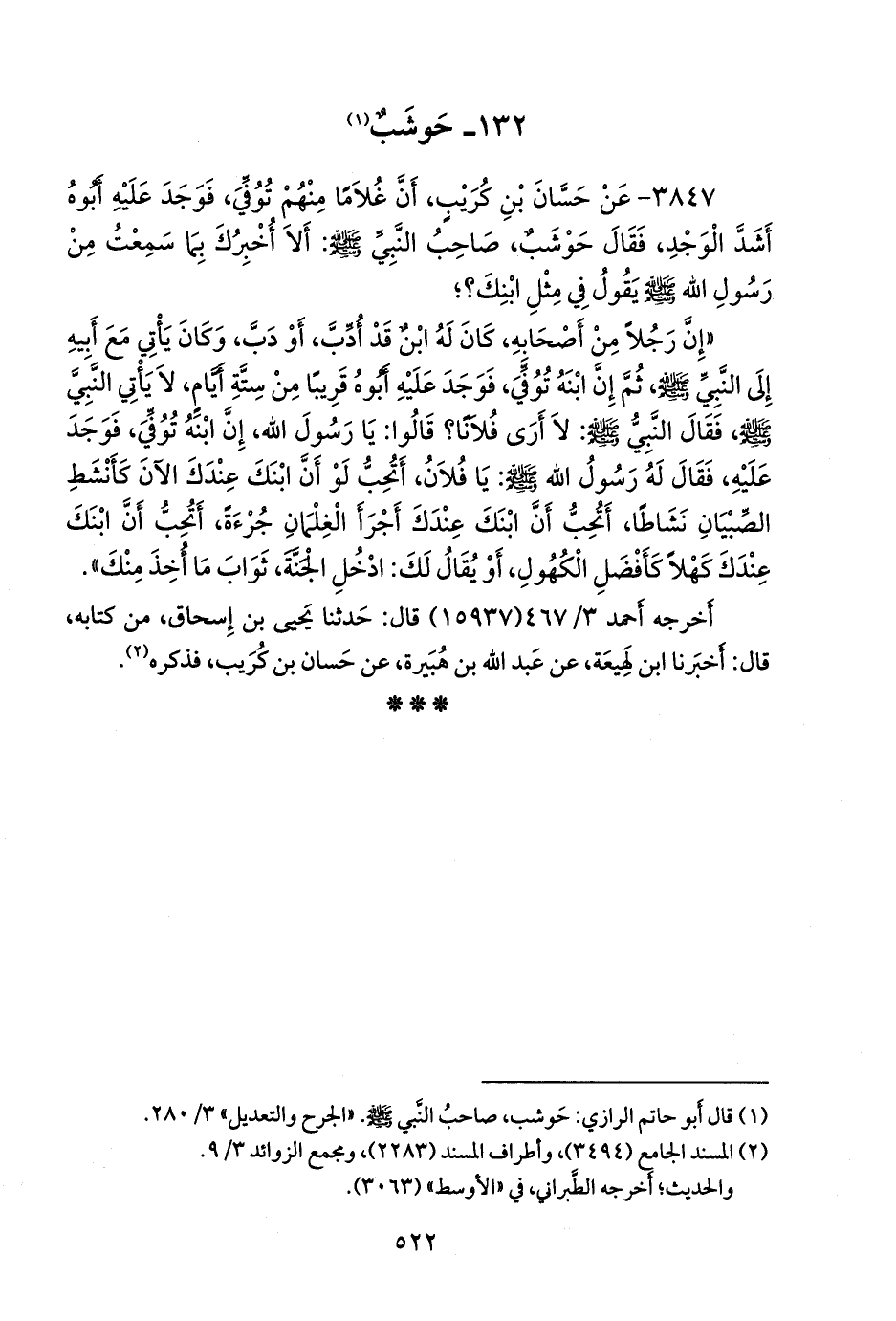 (¬١) قال أَبو حاتم الرازي: حوشب، صاحب النبي صَلى الله عَليه وسَلم. «الجرح والتعديل» ٣/ ٢٨٠.