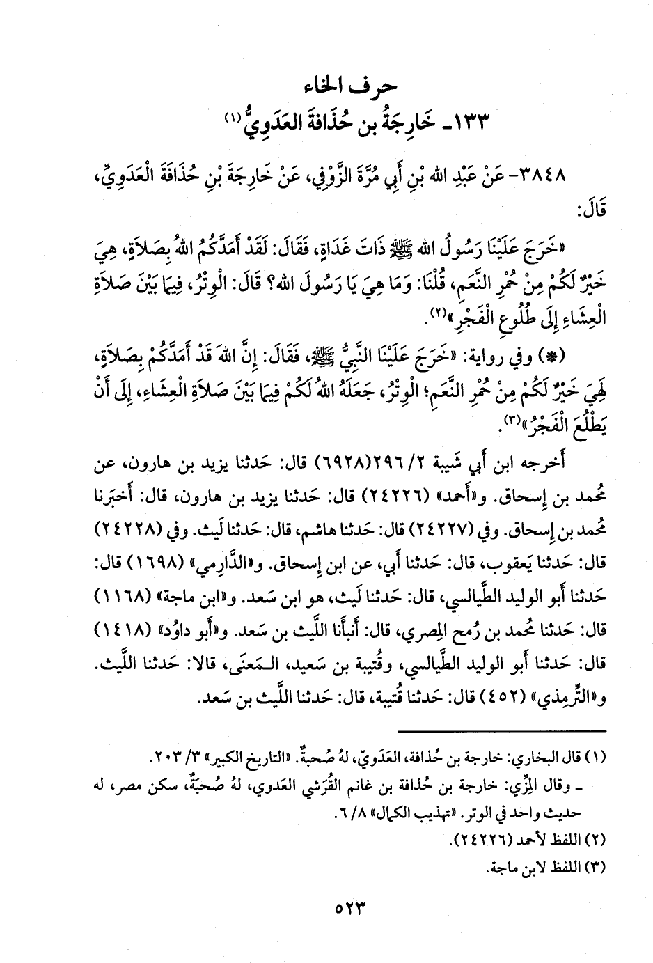 (¬١) قال البخاري: خارجة بن حذافة، العدوي، له صحبة. «التاريخ الكبير» ٣/ ٢٠٣، وقال المِزِّي: خارجة بن حذافة بن غانم القرشي العدوي، له صحبة، سكن مصر، له حديث واحد في الوتر. «تهذيب الكمال» ٨/ ٦.