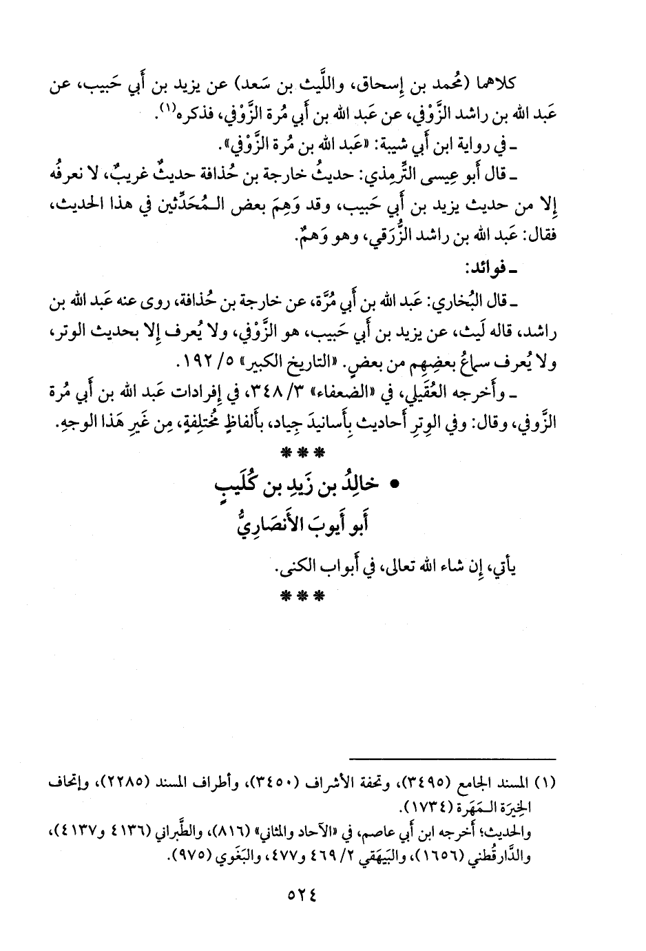 - قلنا: إسناده ضعيفٌ؛ قال البخاري: عبد الله بن أبي مرة، عن خارجة بن حذافة، روى عنه عبد الله بن راشد، قاله ليث، عن يزيد بن أبي حبيب، هو الزوفي، ولا يعرف إلا بحديث الوتر، ولا يعرف سماع بعضهم من بعض. «التاريخ الكبير» ٥/ ١٩٢.
