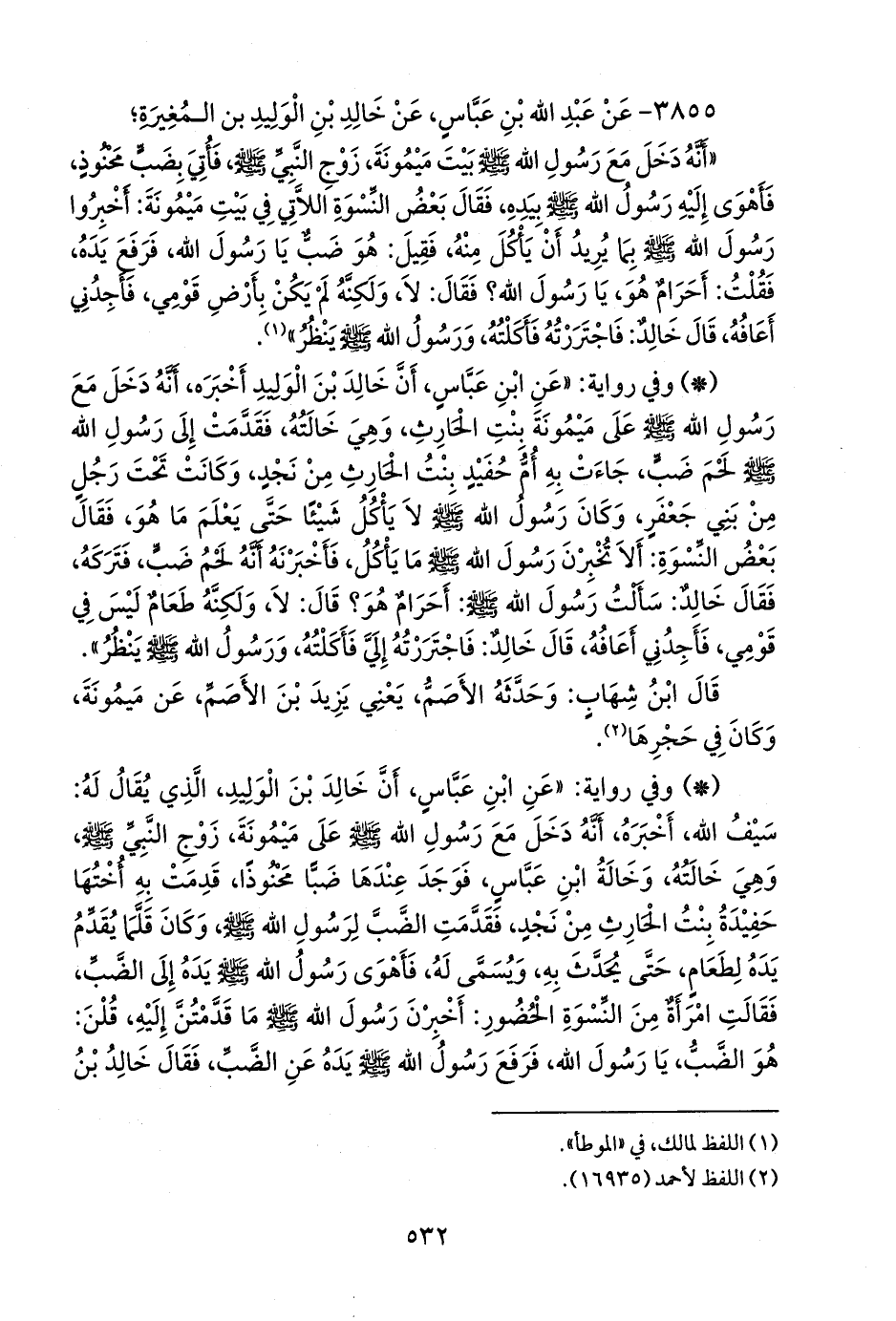 - وفي رواية: «عن ابن عباس، أن خالد بن الوليد أخبره، أنه دخل مع رسول الله صَلى الله عَليه وسَلم على ميمونة بنت الحارث، وهي خالته، فقدمت إلى رسول الله صَلى الله عَليه وسَلم لحم ضب، جاءت به أم حفيد بنت الحارث من نجد، وكانت تحت رجل من بني جعفر، وكان رسول الله صَلى الله عَليه وسَلم لا يأكل شيئًا حتى يعلم ما هو، فقال بعض النسوة: ألا تخبرن رسول الله صَلى الله عَليه وسَلم ما يأكل، فأخبرنه أنه لحم ضب، فتركه، فقال خالد: سألت رسول الله صَلى الله عَليه وسَلم: أحرام هو؟ قال: لا، ولكنه طعام ليس في قومي، فأجدني أعافه، قال خالد: فاجتررته إلي فأكلته، ورسول الله صَلى الله عَليه وسَلم ينظر».