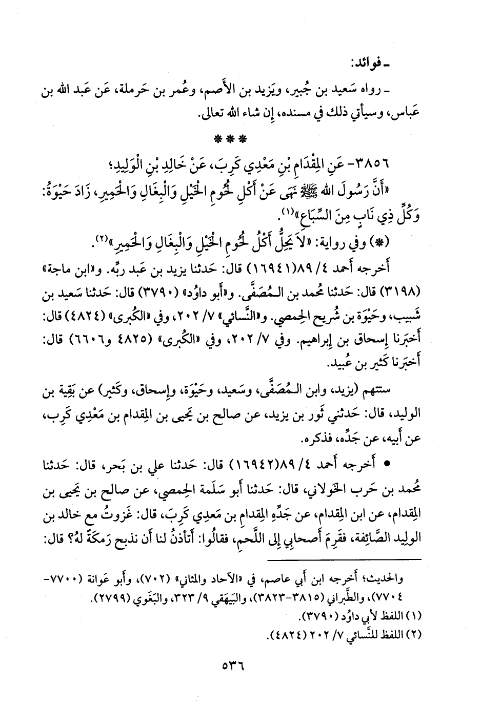- قال أبو عبد الرَّحمَن النَّسَائي (٥٠٣٦): الذي قبل هذا الحديث أصح منه (¬٣)، ويُشبه أَن يكون هذا إن كان صحيحًا أن يكون منسوخًا، لأن قولَه: «أَذِنَ في أَكلِ لحومِ الخَيل» دليل على ذلك.