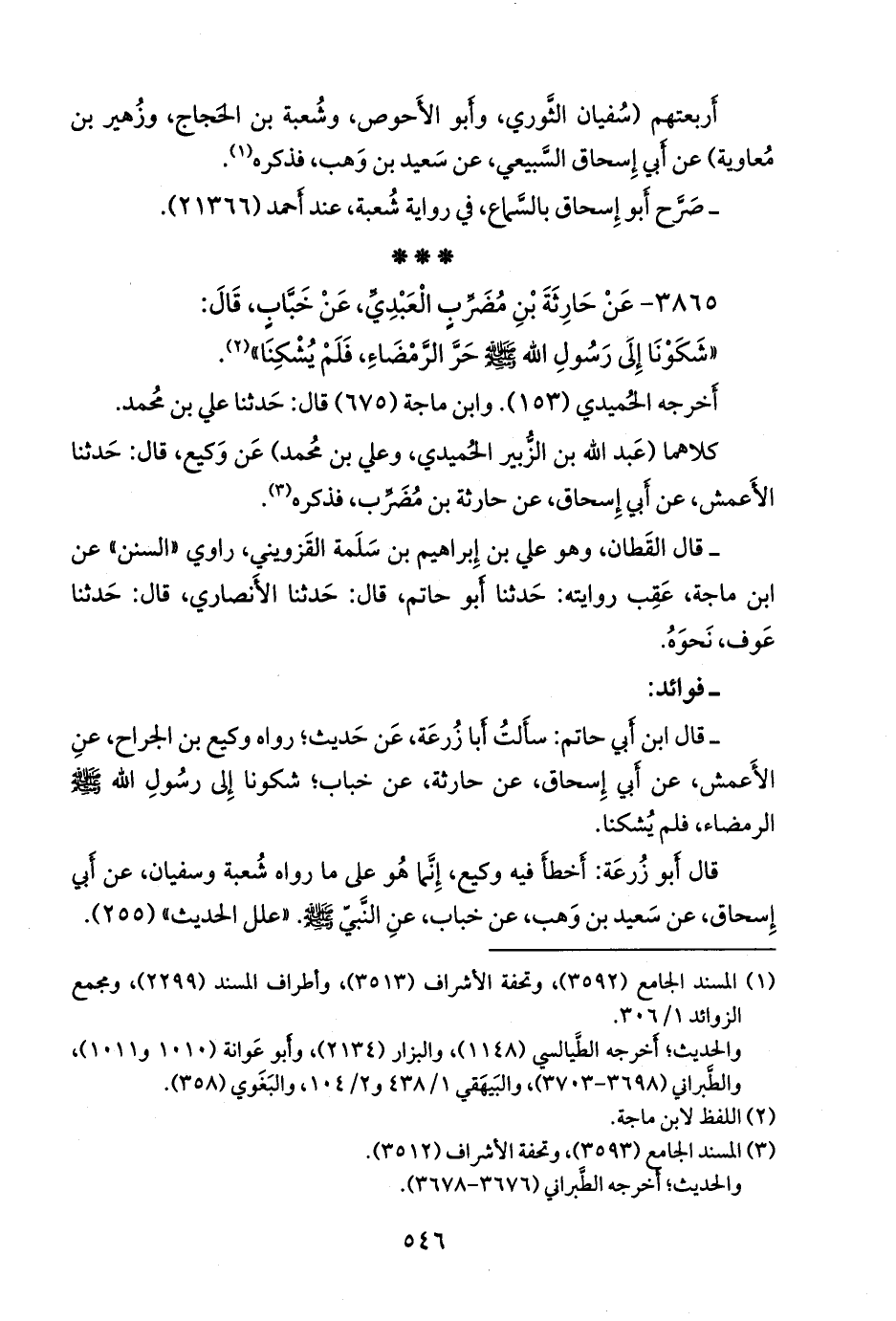 - قال عبد الرَّحمَن بن أبي حاتم الرازي: سألت أَبا زُرعَة، عن حديث؛ رواه وكيع بن الجراح، عن الأعمش، عن أبي إسحاق، عن حارثة، عن خباب؛ شكونا إلى رسول الله صَلى الله عَليه وسَلم الرمضاء، فلم يشكنا.
