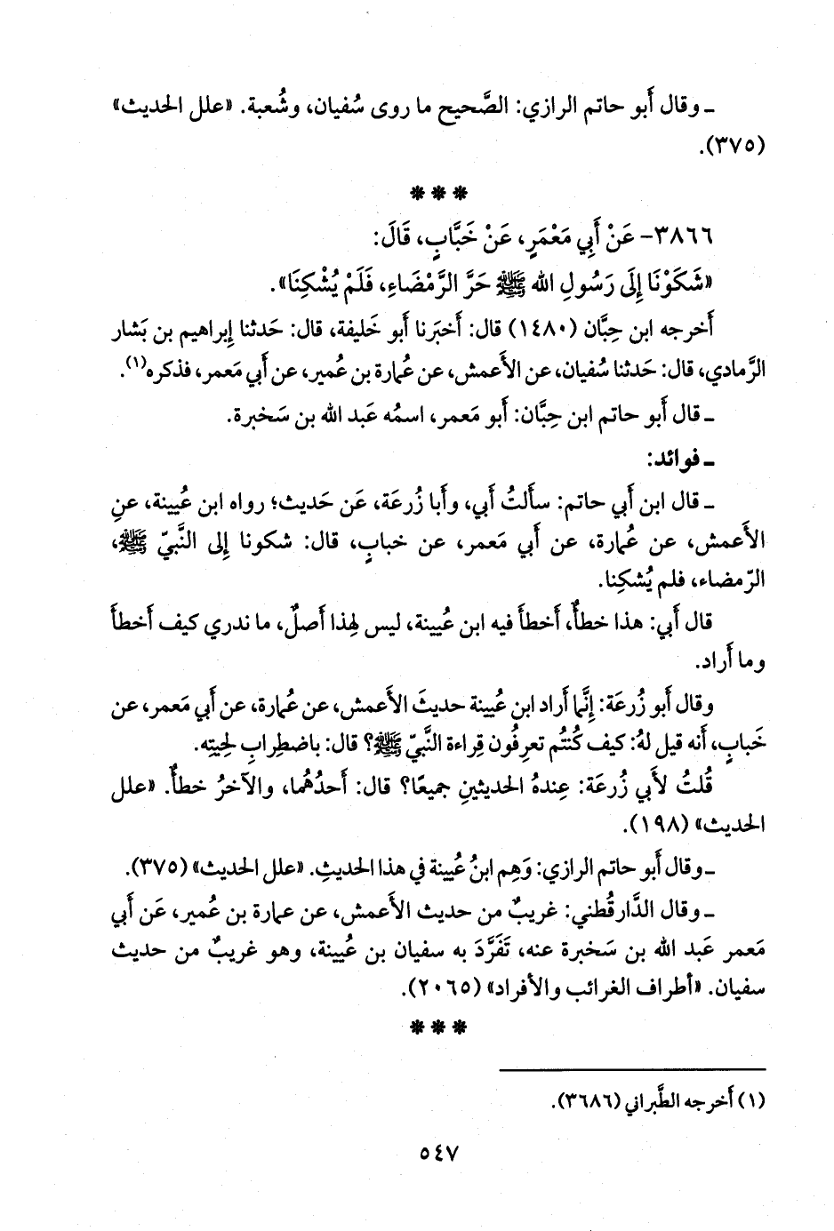 - قال عبد الرَّحمَن بن أبي حاتم الرازي: سألت أبي، وأَبا زُرعَة، عن حديث؛ رواه ابن عُيينة، عن الأعمش، عن عمارة، عن أبي معمر، عن خباب، قال: شكونا إلى النبي صَلى الله عَليه وسَلم الرمضاء، فلم يشكنا.