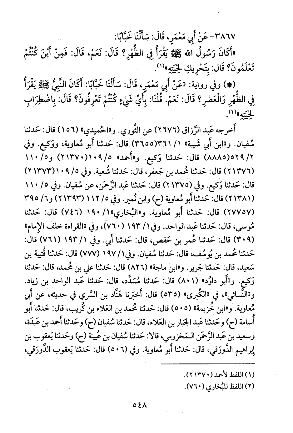 و «أَبو داود» (٨٠١) قال: حدثنا مُسدد، قال: حدثنا عبد الواحد بن زياد. و «النَّسَائي» في «الكبرى» (٥٣٥) قال: أخبرنا هَنَّاد بن السَّري في حديثه، عن أبي معاوية. و «ابن خزيمة» (٥٠٥) قال: حدثنا محمد بن العلاء بن كُريب، قال: حدثنا أَبو أُسامة (ح) وحدثنا عبد الجبار بن العلاء، قال: حدثنا سفيان (ح) وحدثنا أحمد بن عَبدة، وسعيد بن عبد الرَّحمَن المخزومي، قالا: حدثنا سفيان بن عُيينة (ح) وحدثنا يعقوب بن إبراهيم الدورقي، قال: حدثنا أَبو معاوية. وفي (٥٠٦) قال: حدثنا يعقوب الدورقي،