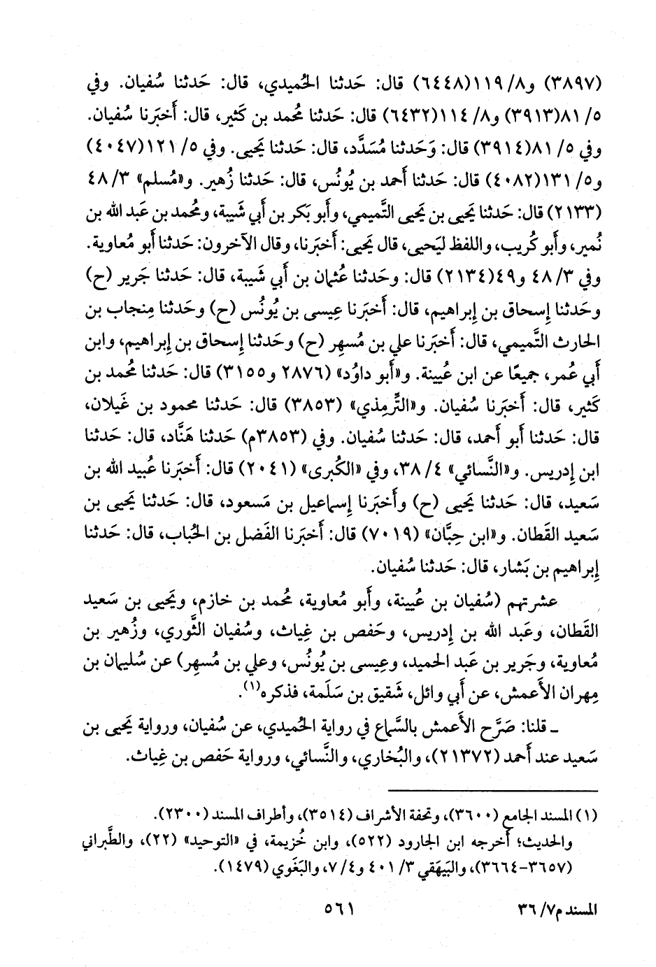 - صرح الأعمش بالسماع في رواية الحميدي، عن سفيان، ورواية يحيى بن سعيد عند أحمد (٢١٣٧٢)، والبخاري، والنَّسَائي، ورواية حفص بن غياث.