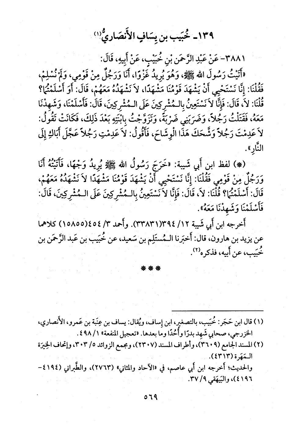 (¬١) قال ابن حجر: خبيب، بالتصغير، ابن إساف، ويقال: يساف بن عنبة بن عَمرو، الأَنصاري، الخزرجي، صحابي شهد بَدرًا وأحدا وما بعدها. «تعجيل المنفعة» ١/ ٤٩٨.