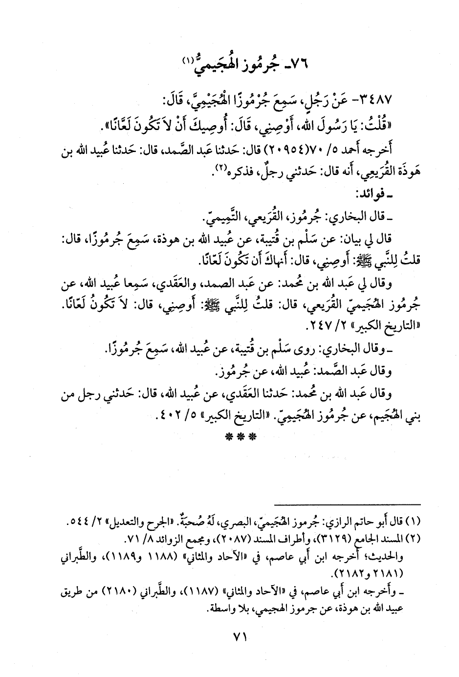 وقال لي عبد الله بن محمد: عن عبد الصمد، والعَقَدي، سمعا عُبيد الله، عن جرموز الهجيمي القريعي، قال: قلت للنبي صَلى الله عَليه وسَلم: أوصني، قال: لا تكون لعانا. «التاريخ الكبير» ٢/ ٢٤٧.