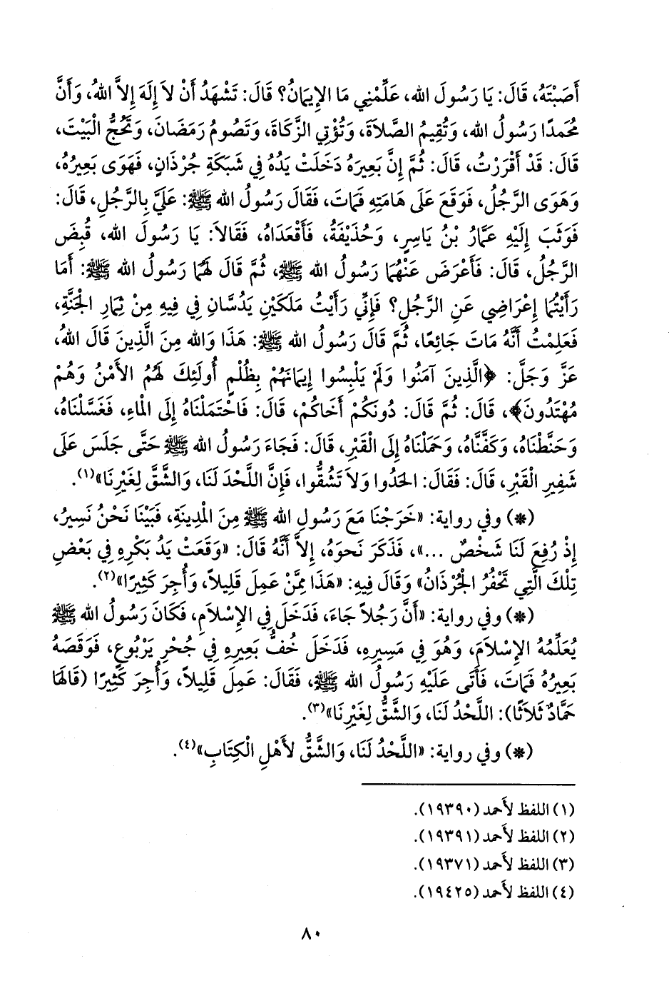 - وفي رواية: «أن رجلا جاء، فدخل في الإسلام، فكان رسول الله صَلى الله عَليه وسَلم يعلمه الإسلام، وهو في مسيره، فدخل خف بعيره في جحر يربوع، فوقصه بعيره فمات، فأتى عليه رسول الله صَلى الله عَليه وسَلم فقال: عمل قليلا، وأجر كثيرا (قالها حماد ثلاثا): اللحد لنا، والشق لغيرنا» (¬٢).