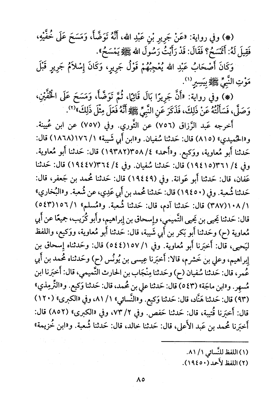 - أخرجه ابن أبي شيبة (١٩١٦) قال: حدثنا هُشيم، قال: أَخبرنا مُغيرة، عن إِبراهيم، قال: كان جَرير بن عبد الله يمسح على الخُفين، قال: وكان أَعجبَ إِليَّ، لِأَن إِسلام جَرير إِنما كان بعد نزول المائدة. «مُرسَلٌ».