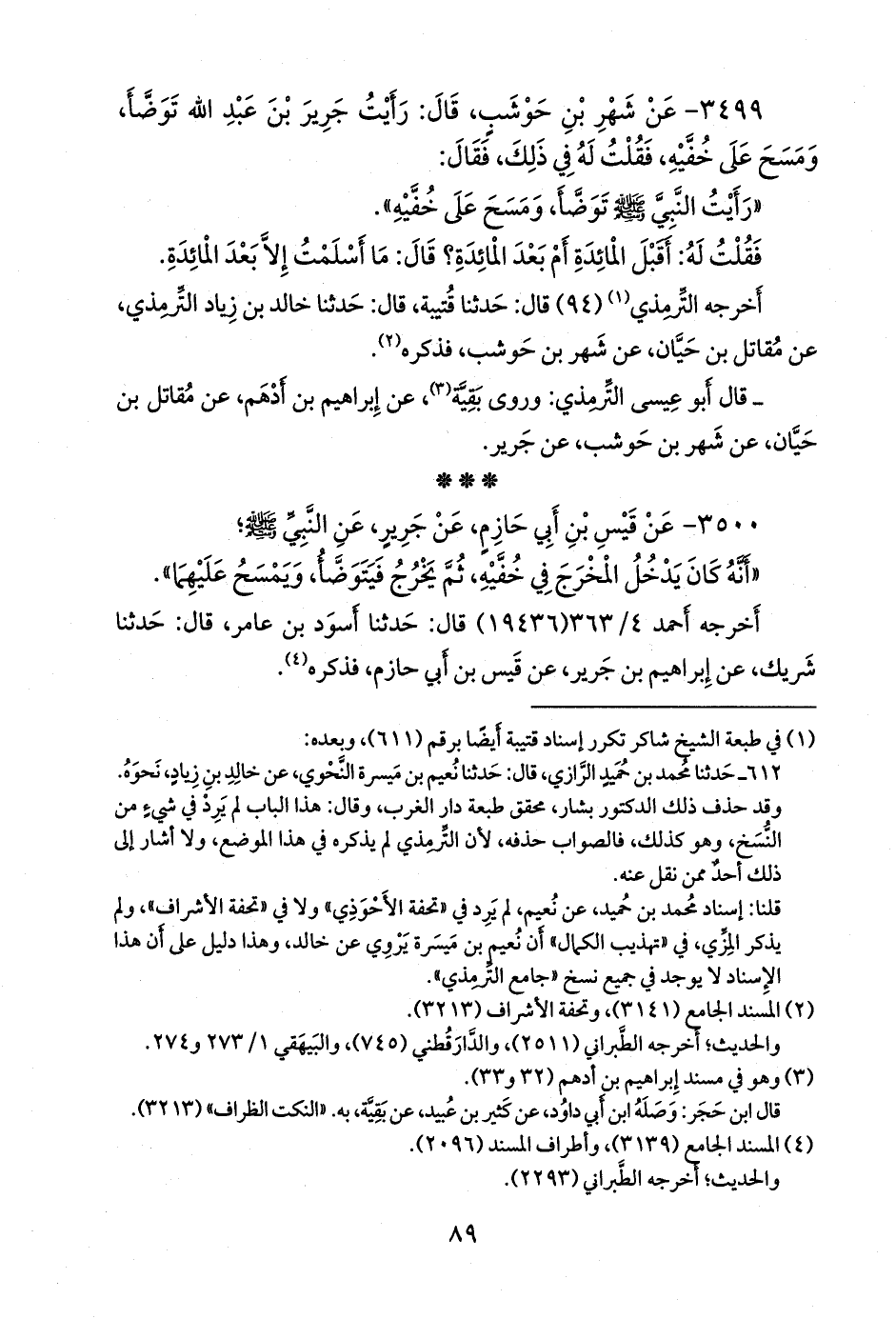 ٣٤٩٩ - عن شهر بن حوشب، قال: رأيت جَرير بن عبد الله توضأ، ومسح على خفيه، فقلت له في ذلك، فقال:
