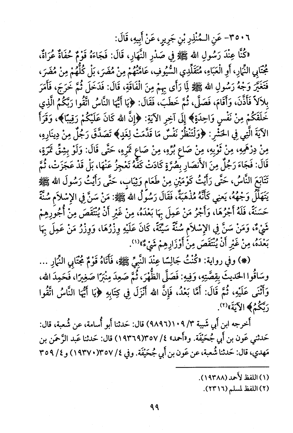 - وفي رواية: «كنت جالسا عند النبي صَلى الله عَليه وسَلم فأتاه قوم مجتابي النمار ... وساقوا الحديث بقصته، وفيه: فصلى الظهر، ثم صعد منبرا صغيرا، فحمد الله، وأثنى عليه، ثم قال: أما بعد، فإن الله أنزل في كتابه: {يا أيها الناس اتقوا ربكم} الآية» (¬٢).