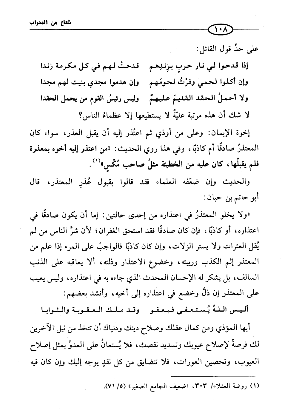 «ولا يخلو المعتذرُ في اعتذاره من إحدى حالتين: إما أن يكون صادقًا في اعتذاره، أو كاذبًا، فإن كان صادقًا فقد استحق الغفران؛ لأن شرَّ الناس من لم يُقل العثرات ولا يستر الزلات، وإن كان كاذبًا فالواجبُ على المرء إذا علم من المعتذر إثم الكذب وريبته، وخضوع الاعتذار وذلته، ألا يعاقبه على الذنب السالف، بل يشكر له الإحسان المحدث الذي جاءه به في اعتذاره، وليس يعيب على المعتذر إن ذلَّ وخضع في اعتذاره إلى أخيه، وأنشد بعضهم:
