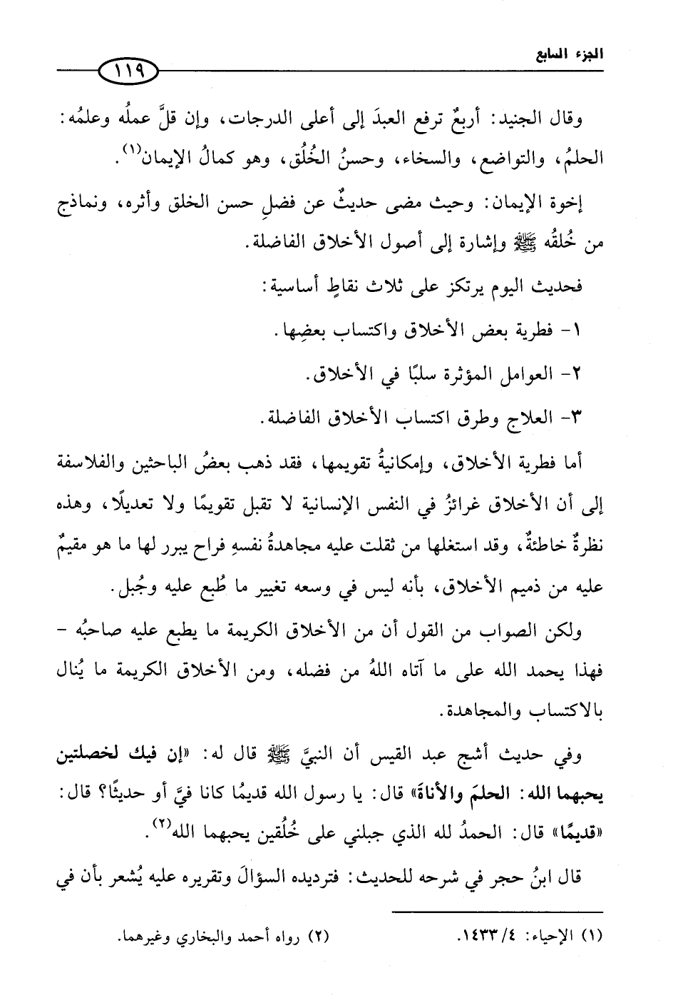وفي حديث أشج عبد القيس أن النبيَّ صلى الله عليه وسلم قال له: «إن فيك لخصلتين يحبهما الله: الحلمَ والأناةَ» قال: يا رسول الله قديمًا كانا فيَّ أو حديثًا؟ قال: «قديمًا» قال: الحمدُ لله الذي جبلني على خُلُقين يحبهما الله (¬2).