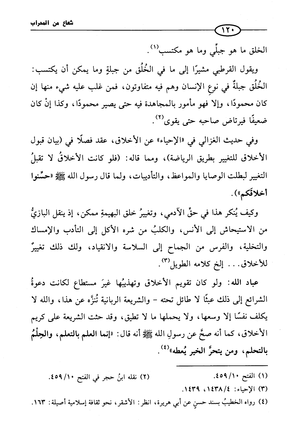 وفي حديث الغزالي في «الإحياء» عن الأخلاق، عقد فصلًا في (بيان قبول الأخلاق للتغيير بطريق الرياضة)، ومما قاله: (فلو كانت الأخلاقُ لا تقبلُ التغيير لبطلت الوصايا والمواعظ، والتأديبات، ولما قال رسول الله صلى الله عليه وسلم «حسِّنوا أخلاقَكم»).