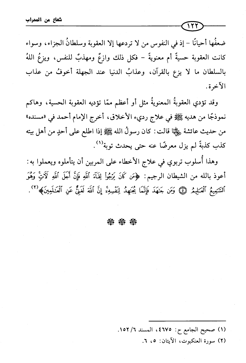 وقد تؤدي العقوبةُ المعنويةُ مثل أو أعظم ممّا تؤديه العقوبة الحسية، وهاكم نموذجًا من هديه صلى الله عليه وسلم في علاج رديء الأخلاق، أخرج الإمام أحمد في «مسنده» من حديث عائشة رضي الله عنها قالت: كان رسولُ الله صلى الله عليه وسلم إذا اطلع على أحدٍ من أهل بيته كذب كذبةً لم يزل معرضًا عنه حتى يحدث توبة (¬1).