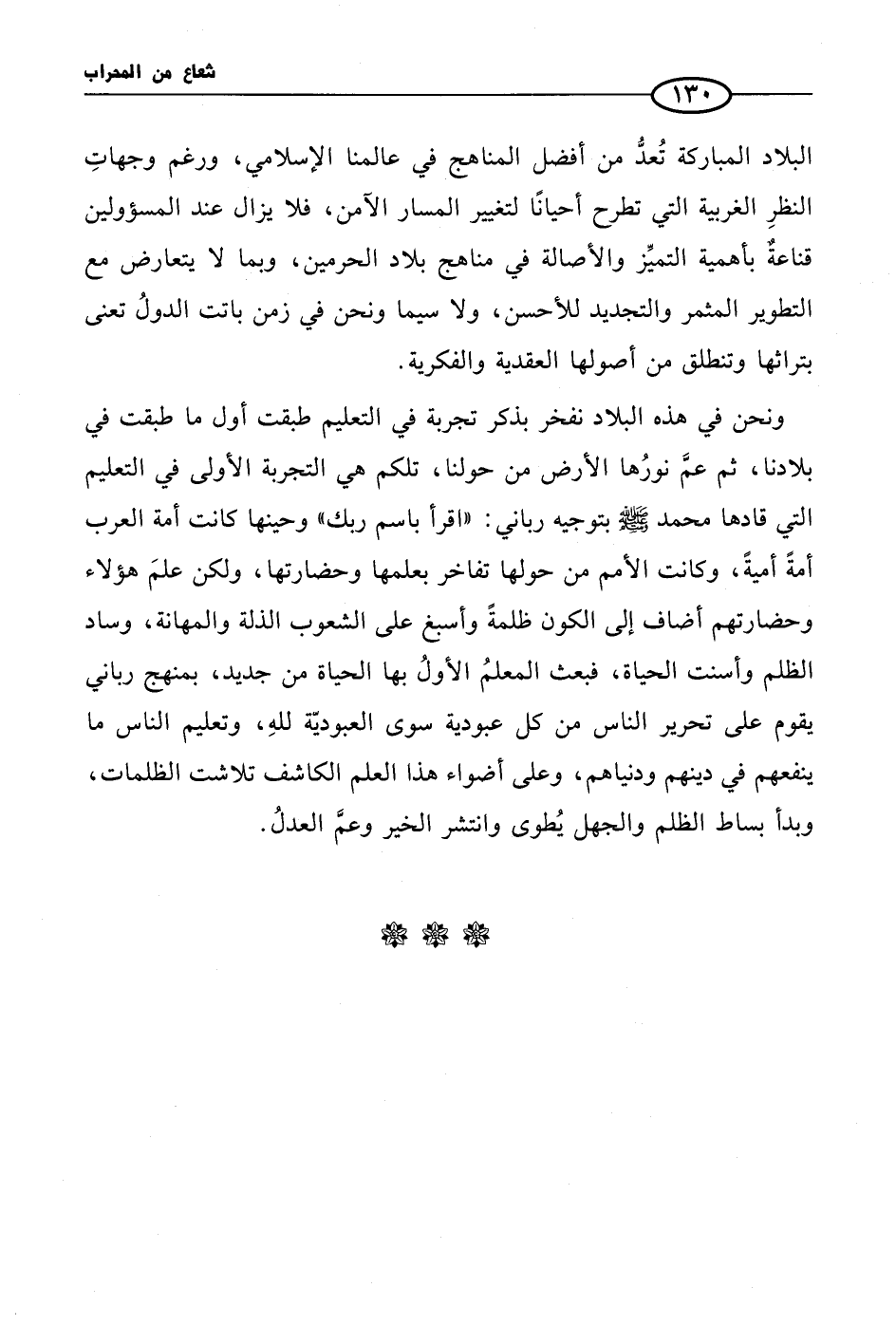 ونحن في هذه البلاد نفخر بذكر تجربة في التعليم طبقت أول ما طبقت في بلادنا، ثم عمَّ نورُها الأرض من حولنا، تلكم هي التجربة الأولى في التعليم التي قادها محمد صلى الله عليه وسلم بتوجيه رباني: «اقرأ باسم ربك» وحينها كانت أمة العرب أمةً أميةً، وكانت الأمم من حولها تفاخر بعلمها وحضارتها، ولكن علمَ هؤلاء وحضارتهم أضاف إلى الكون ظلمةً وأسبغ على الشعوب الذلة والمهانة، وساد الظلم وأسنت الحياة، فبعث المعلمُ الأولُ بها الحياة من جديد، بمنهج رباني يقوم على تحرير الناس من كل عبودية سوى العبوديّة للهِ، وتعليم الناس ما ينفعهم في دينهم ودنياهم، وعلى أضواء هذا العلم الكاشف تلاشت الظلمات، وبدأ بساط الظلم والجهل يُطوى وانتشر الخير وعمَّ العدلُ.