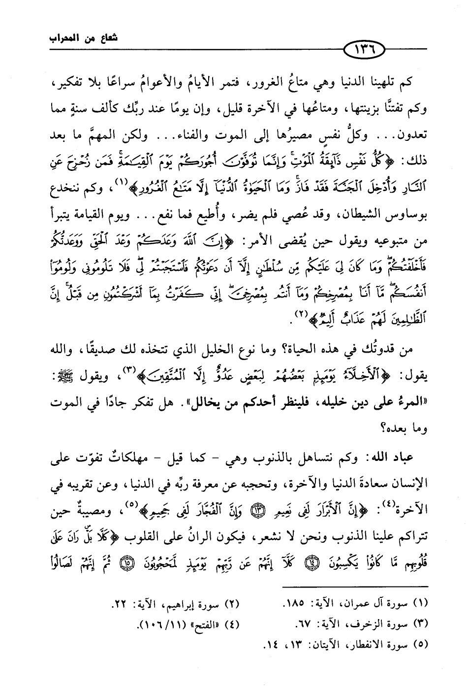 كم تلهينا الدنيا وهي متاعُ الغرور، فتمر الأيامُ والأعوامُ سراعًا بلا تفكير، وكم تفتنَّا بزينتها، ومتاعُها في الآخرة قليل، وإن يومًا عند ربِّك كألف سنةٍ مما تعدون ... وكلُّ نفسٍ مصيرُها على الموت والفناء ... ولكن المهمَّ ما بعد ذلك: {كُلُّ نَفْسٍ ذَائِقَةُ الْمَوْتِ وَإِنَّمَا تُوَفَّوْنَ أُجُورَكُمْ يَوْمَ الْقِيَامَةِ فَمَنْ زُحْزِحَ عَنِ النَّارِ وَأُدْخِلَ الْجَنَّةَ فَقَدْ فَازَ وَمَا الْحَيَاةُ الدُّنْيَا إِلَّا مَتَاعُ الْغُرُورِ} (¬1)، وكم ننخدع بوساوس الشيطان، وقد عُصي فلم يضر، وأُطيع فما نفع ... ويوم القيامة يتبرأ من متبوعيه ويقول حين يُقضى الأمر: {إِنَّ اللَّهَ وَعَدَكُمْ وَعْدَ الْحَقِّ وَوَعَدْتُكُمْ فَأَخْلَفْتُكُمْ وَمَا كَانَ لِيَ عَلَيْكُمْ مِنْ سُلْطَانٍ إِلَّا أَنْ دَعَوْتُكُمْ فَاسْتَجَبْتُمْ لِي فَلَا تَلُومُونِي وَلُومُوا أَنْفُسَكُمْ مَا أَنَا بِمُصْرِخِكُمْ وَمَا أَنْتُمْ بِمُصْرِخِيَّ إِنِّي كَفَرْتُ بِمَا أَشْرَكْتُمُونِ مِنْ قَبْلُ إِنَّ الظَّالِمِينَ لَهُمْ عَذَابٌ أَلِيمٌ} (¬2).