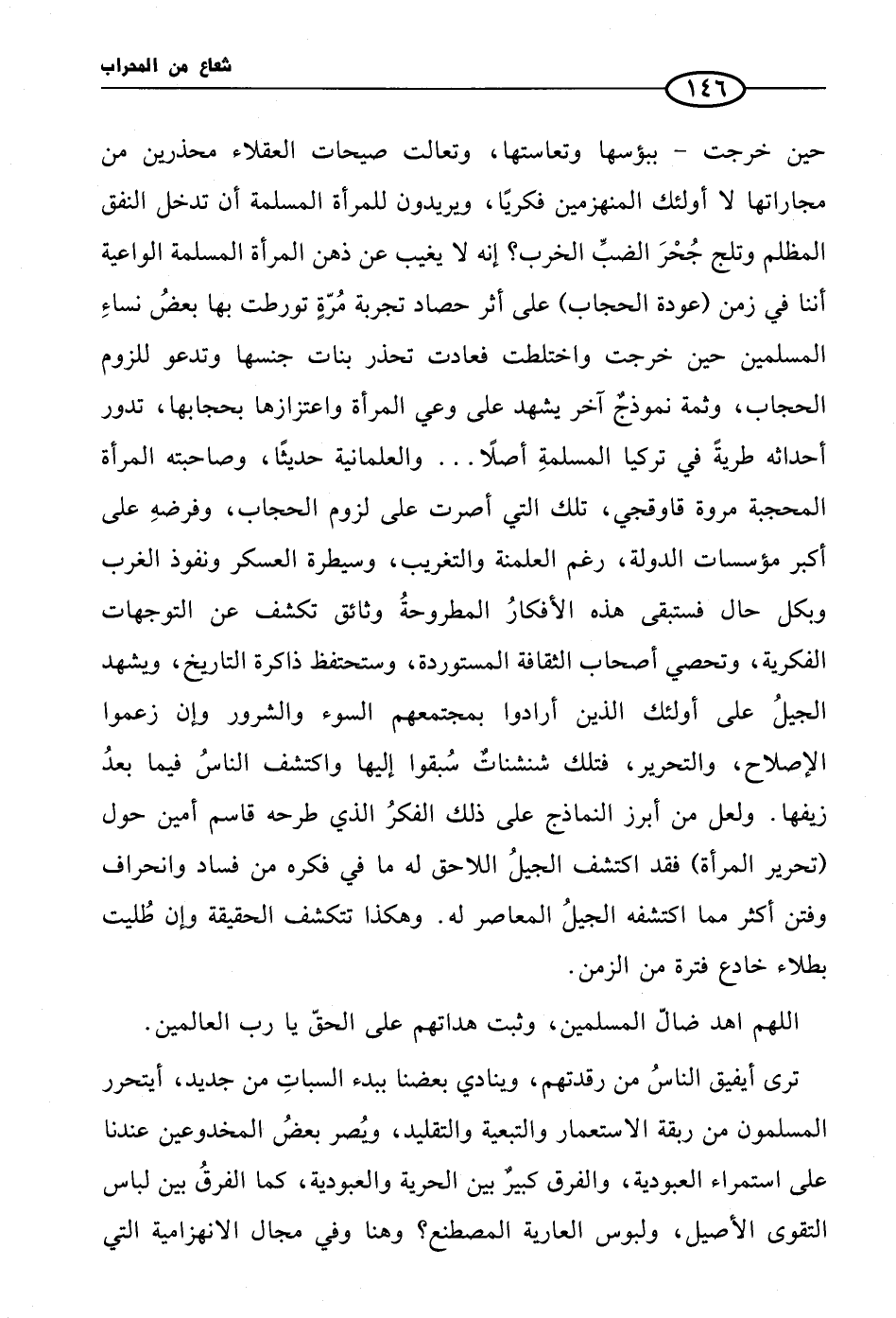 حين خرجت - ببؤسها وتعاستها، وتعالت صيحات العقلاء محذرين من مجاراتها لا أولئك المنهزمين فكريًا، ويريدون للمرأة المسلمة أن تدخل النفق المظلم وتلج جُحْرَ الضبِّ الخرب؟ إنه لا يغيب عن ذهن المرأة المسلمة الواعية أننا في زمن (عودة الحجاب) على أثر حصاد تجربة مُرّةٍ تورطت بها بعضُ نساءِ المسلمين حين خرجت واختلطت فعادت تحذر بنات جنسها وتدعو للزوم الحجاب، وثمة نموذجٌ آخر يشهد على وعي المرأة واعتزازها بحجابها، تدور أحداثه طريةً في تركيا المسلمةِ أصلًا ... والعلمانية حديثًا، وصاحبته المرأة المحجبة مروة قاوقجي، تلك التي أصرت على لزوم الحجاب، وفرضهِ على أكبر مؤسسات الدولة، رغم العلمنة والتغريب، وسيطرة العسكر ونفوذ الغرب وبكل حال فستبقى هذه الأفكارُ المطروحةُ وثائق تكشف عن التوجهات الفكرية، وتحصي أصحاب الثقافة المستوردة، وستحتفظ ذاكرة التاريخ، ويشهد الجيلُ على أولئك الذين أرادوا بمجتمعهم السوء والشرور وإن زعموا الإصلاح، والتحرير، فتلك شنشناتٌ سُبقوا إليها واكتشف الناسُ فيما بعدُ زيفها. ولعل من أبرز النماذج على ذلك الفكرُ الذي طرحه قاسم أمين حول (تحرير المرأة) فقد اكتشف الجيلُ اللاحق له ما في فكره من فساد وانحراف وفتن أكثر مما اكتشفه الجيلُ المعاصر له. وهكذا تتكشف الحقيقة وإن طُليت بطلاء خادع فترة من الزمن.