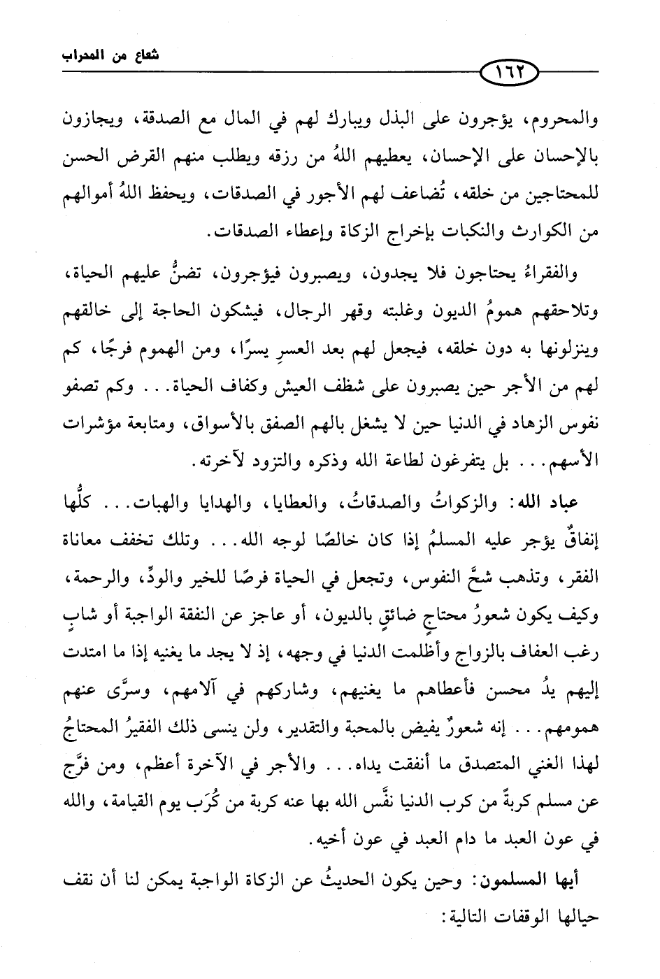 عباد الله: والزكواتُ والصدقاتُ، والعطايا، والهدايا والهبات ... كلُّها إنفاقٌ يؤجر عليه المسلمُ إذا كان خالصًا لوجه الله ... وتلك تخفف معاناة الفقر، وتذهب شحَّ النفوس، وتجعل في الحياة فرصًا للخير والودِّ، والرحمة، وكيف يكون شعورُ محتاجٍ ضائقٍ بالديون، أو عاجز عن النفقة الواجبة أو شابٍ رغب العفاف بالزواج وأظلمت الدنيا في وجهه، إذ لا يجد ما يغنيه إذا ما امتدت إليهم يدُ محسن فأعطاهم ما يغنيهم، وشاركهم في آلامهم، وسرَّى عنهم همومهم ... إنه شعورٌ يفيض بالمحبة والتقدير، ولن ينسى ذلك الفقيرُ المحتاجُ لهذا الغني المتصدق ما أنفقت يداه ... والأجر في الآخرة أعظم، ومن فرَّج عن مسلم كربةً من كرب الدنيا نفَّس الله بها عنه كربة من كُرَب يوم القيامة، والله في عون العبد ما دام العبد في عون أخيه.
