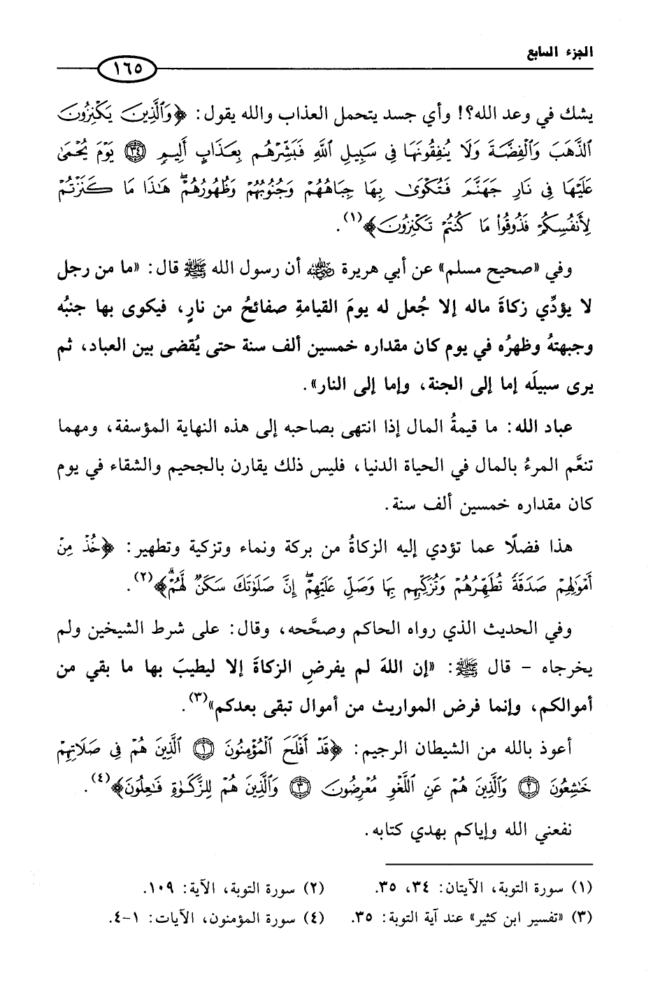 يشك في وعد الله؟ ! وأي جسد يتحمل العذاب والله يقول: {وَالَّذِينَ يَكْنِزُونَ الذَّهَبَ وَالْفِضَّةَ وَلَا يُنْفِقُونَهَا فِي سَبِيلِ اللَّهِ فَبَشِّرْهُمْ بِعَذَابٍ أَلِيمٍ (34) يَوْمَ يُحْمَى عَلَيْهَا فِي نَارِ جَهَنَّمَ فَتُكْوَى بِهَا جِبَاهُهُمْ وَجُنُوبُهُمْ وَظُهُورُهُمْ هَذَا مَا كَنَزْتُمْ لِأَنْفُسِكُمْ فَذُوقُوا مَا كُنْتُمْ تَكْنِزُونَ} (¬1).