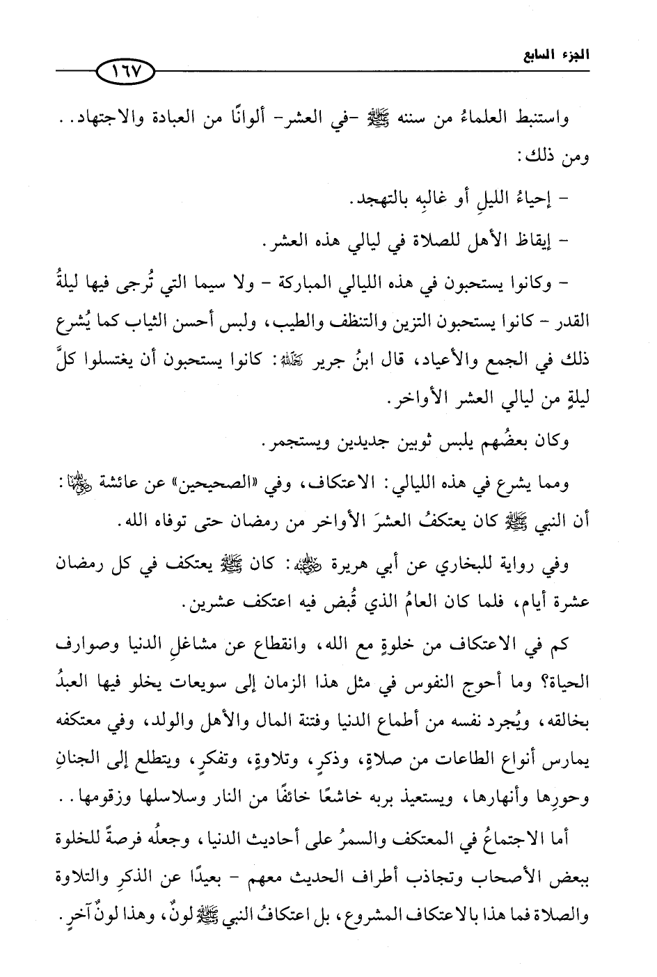 واستنبط العلماءُ من سننه صلى الله عليه وسلم - في العشر - ألوانًا من العبادة والاجتهاد .. ومن ذلك: