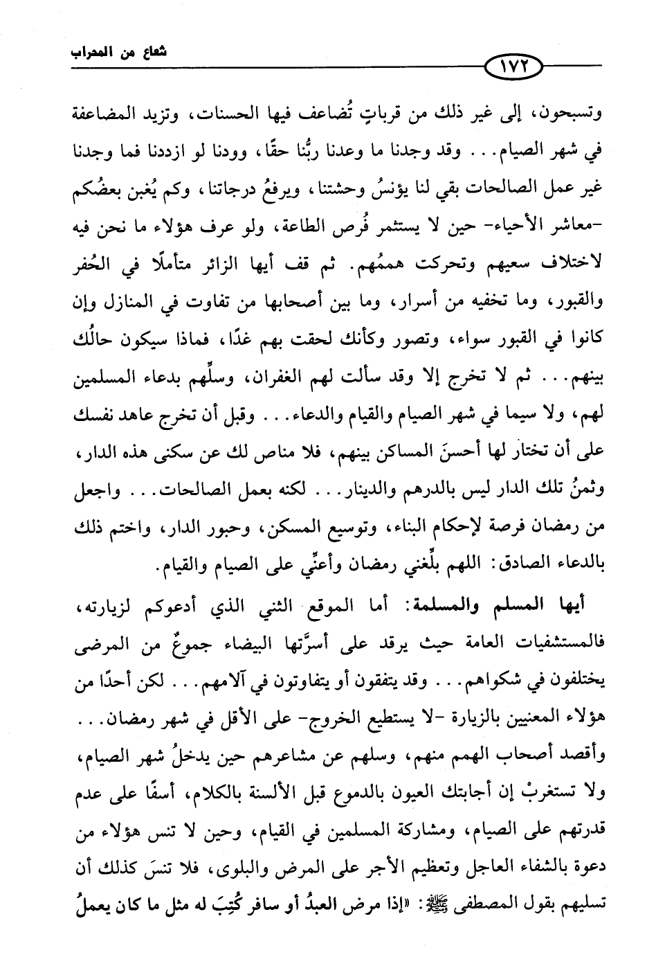 وتسبحون، إلى غير ذلك من قرباتٍ تُضاعف فيها الحسنات، وتزيد المضاعفة في شهر الصيام ... وقد وجدنا ما وعدنا ربُّنا حقًا، وودنا لو ازددنا فما وجدنا غير عمل الصالحات بقي لنا يؤنسُ وحشتنا، ويرفعُ درجاتنا، وكم يُغبن بعضُكم - معاشر الأحياء - حين لا يستثمر فُرص الطاعة، ولو عرف هؤلاء ما نحن فيه لاختلاف سعيهم وتحركت هممُهم. ثم قف أيها الزائر متأملًا في الحُفر والقبور، وما تخفيه من أسرار، وما بين أصحابها من تفاوت في المنازل وإن كانوا في القبور سواء، وتصور وكأنك لحقت بهم غدًا، فماذا سيكون حالُك بينهم ... ثم لا تخرج إلا وقد سألت لهم الغفران، وسلِّهم بدعاء المسلمين لهم، ولا سيما في شهر الصيام والقيام والدعاء ... وقبل أن تخرج عاهد نفسك على أن تختار لها أحسنَ المساكن بينهم، فلا مناص لك عن سكنى هذه الدار، وثمنُ تلك الدار ليس بالدرهم والدينار ... لكنه بعمل الصالحات ... واجعل من رمضان فرصة لإحكام البناء، وتوسيع المسكن، وحبور الدار، واختم ذلك بالدعاء الصادق: اللهم بلِّغني رمضان وأعنِّي على الصيام والقيام.