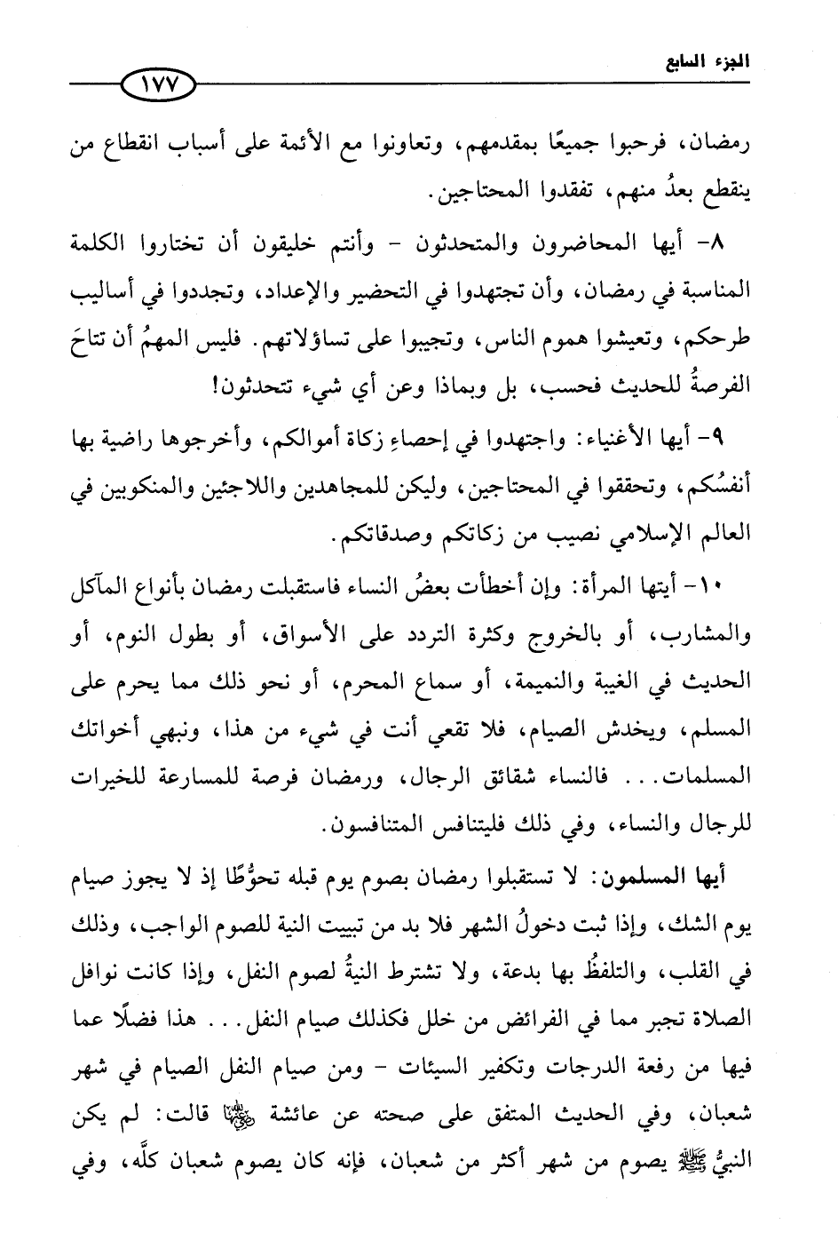 8 - أيها المحاضرون والمتحدثون - وأنتم خليقون أن تختاروا الكلمة المناسبة في رمضان، وأن تجتهدوا في التحضير والإعداد، وتجددوا في أساليب طرحكم، وتعيشوا هموم الناس، وتجيبوا على تساؤلاتهم. فليس المهمُ أن تتاحَ الفرصةُ للحديث فحسب، بل وبماذا وعن أي شيء تتحدثون!
