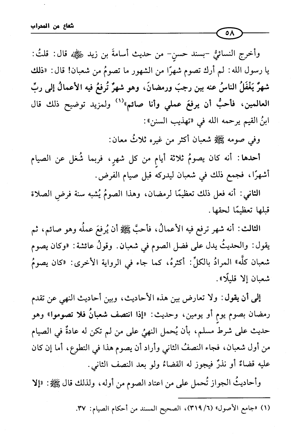 وأخرج النسائيُّ - بسند حسنٍ - من حديث أسامةَ بن زيد رضي الله عنه قال: قلتُ: يا رسول الله: لم أرك تصوم شهرًا من الشهور ما تصومُ من شعبان! قال: «ذلك شهرٌ يَغْفَلُ الناسُ عنه بين رجبَ ورمضانَ، وهو شهرٌ تُرفعُ فيه الأعمالُ إلى ربِّ العالمين، فأحبُّ أن يرفعَ عملي وأنا صائم» (¬1) ولمزيد توضيح ذلك قال ابنُ القيم يرحمه الله في «تهذيب السنن»: