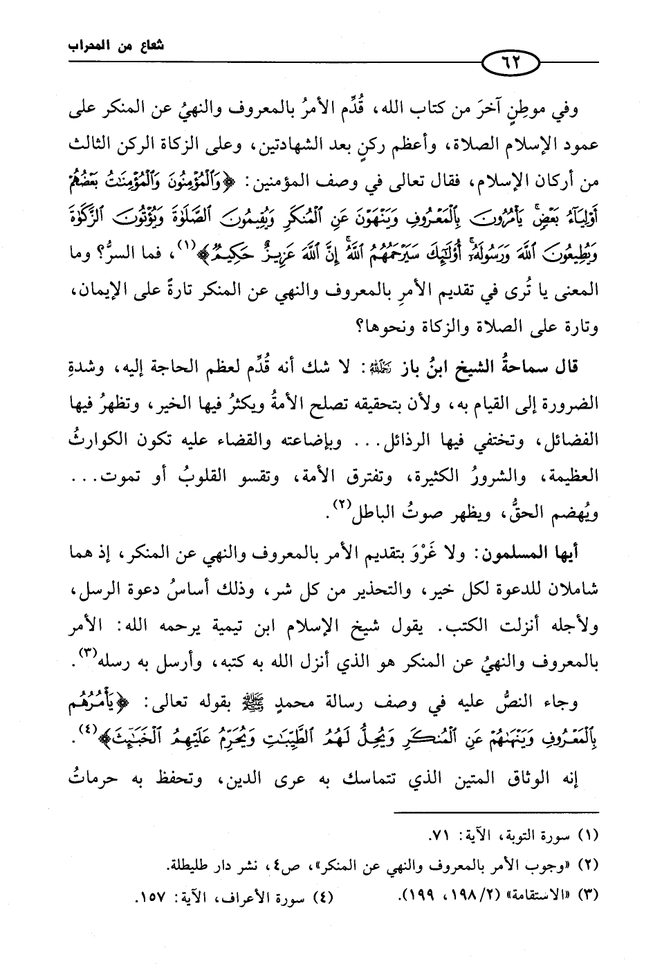 وفي موطِنٍ آخرَ من كتاب الله، قُدِّم الأمرُ بالمعروف والنهيُ عن المنكر على عمود الإسلام الصلاة، وأعظم ركنٍ بعد الشهادتين، وعلى الزكاة الركن الثالث من أركان الإسلام، فقال تعالى في وصف المؤمنين: {وَالْمُؤْمِنُونَ وَالْمُؤْمِنَاتُ بَعْضُهُمْ أَوْلِيَاءُ بَعْضٍ يَأْمُرُونَ بِالْمَعْرُوفِ وَيَنْهَوْنَ عَنِ الْمُنْكَرِ وَيُقِيمُونَ الصَّلَاةَ وَيُؤْتُونَ الزَّكَاةَ وَيُطِيعُونَ اللَّهَ وَرَسُولَهُ أُولَئِكَ سَيَرْحَمُهُمُ اللَّهُ إِنَّ اللَّهَ عَزِيزٌ حَكِيمٌ} (¬1)، فما السرُّ؟ وما المعنى يا تُرى في تقديم الأمرِ بالمعروف والنهي عن المنكر تارةً على الإيمان، وتارة على الصلاة والزكاة ونحوها؟