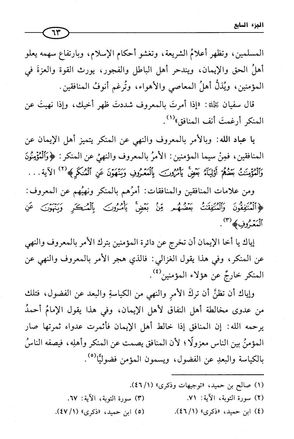 إياك يا أخا الإيمان أن تخرج عن دائرة المؤمنين بترك الأمر بالمعروف والنهي عن المنكر، وفي هذا يقول الغزالي: فالذي هجر الأمر بالمعروف والنهي عن المنكر خارجٌ عن هؤلاء المؤمنين (¬4).