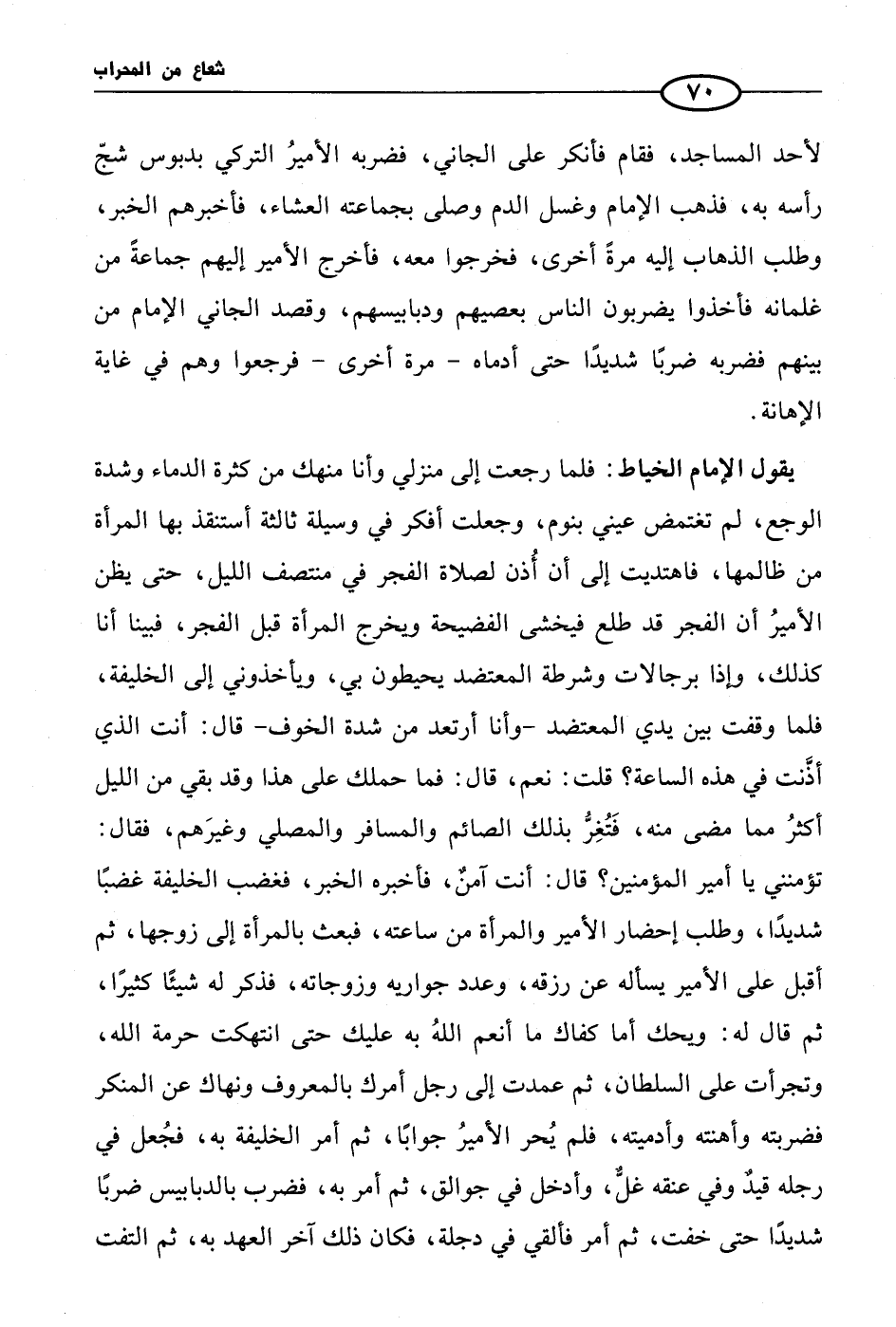 لأحد المساجد، فقام فأنكر على الجاني، فضربه الأميرُ التركي بدبوس شجّ رأسه به، فذهب الإمام وغسل الدم وصلى بجماعته العشاء، فأخبرهم الخبر، وطلب الذهاب إليه مرةً أخرى، فخرجوا معه، فأخرج الأمير إليهم جماعةً من غلمانه فأخذوا يضربون الناس بعصيهم ودبابيسهم، وقصد الجاني الإمام من بينهم فضربه ضربًا شديدًا حتى أدماه - مرة أخرى - فرجعوا وهم في غاية الإهانة.