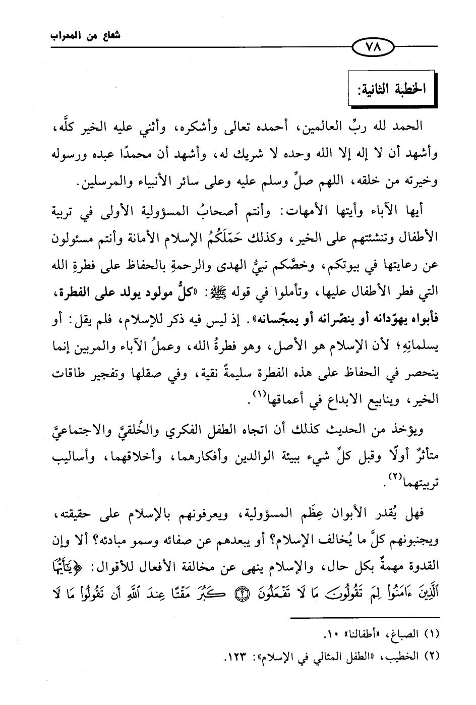 أيها الآباء وأيتها الأمهات: وأنتم أصحابُ المسؤولية الأولى في تربية الأطفال وتنشئتهم على الخير، وكذلك حَمّلَكُمُ الإسلام الأمانة وأنتم مسئولون عن رعايتها في بيوتكم، وخصَّكم نبيُّ الهدى والرحمةِ بالحفاظ على فطرةِ الله التي فطر الأطفال عليها، وتأملوا في قوله صلى الله عليه وسلم: «كلُّ مولود يولد على الفطرة، فأبواه يهوّدانه أو ينصّرانه أو يمجّسانه». إذ ليس فيه ذكر للإسلام، فلم يقل: أو يسلمانِهِ؛ لأن الإسلام هو الأصل، وهو فطرةُ الله، وعملُ الآباء والمربين إنما ينحصر في الحفاظ على هذه الفطرة سليمةً نقية، وفي صقلها وتفجير طاقات الخير، وينابيع الابداع في أعماقها (¬1).
