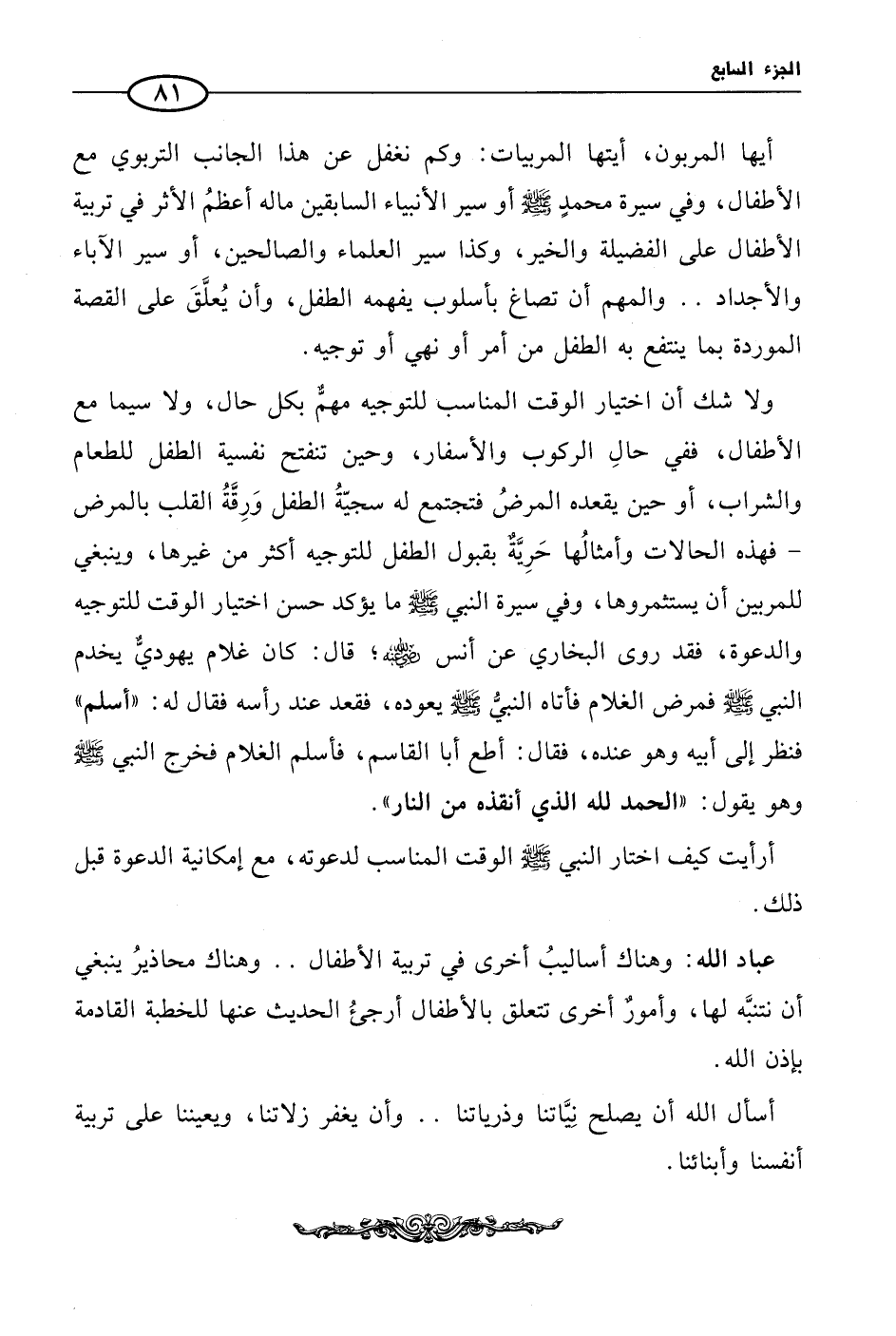 عباد الله: وهناك أساليبُ أخرى في تربية الأطفال .. وهناك محاذيرُ ينبغي أن نتنبَّه لها، وأمورٌ أخرى تتعلق بالأطفال أرجئُ الحديث عنها للخطبة القادمة بإذن الله.