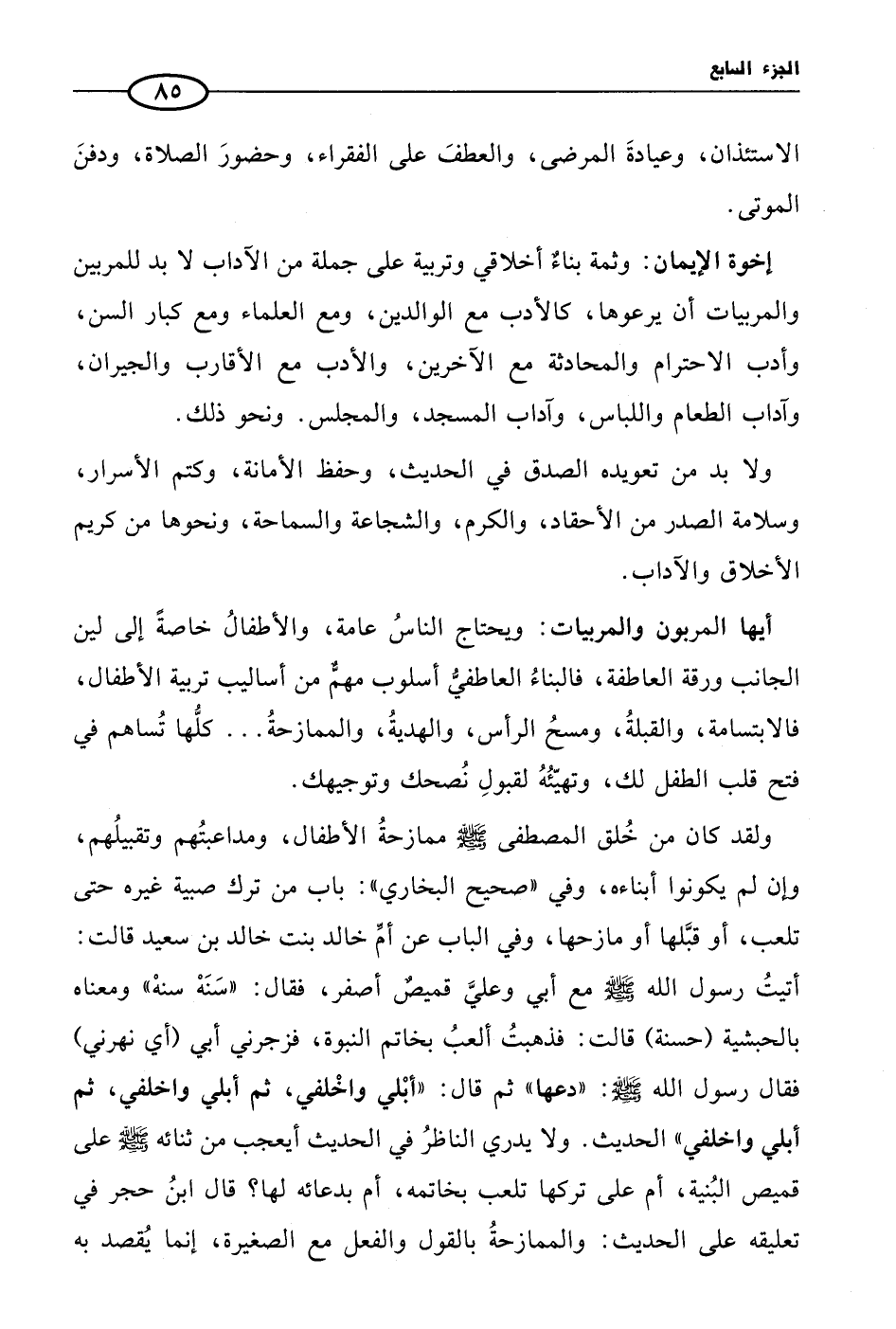 ولقد كان من خُلق المصطفى صلى الله عليه وسلم ممازحةُ الأطفال، ومداعبتُهم وتقبيلُهم، وإن لم يكونوا أبناءه، وفي «صحيح البخاري»: باب من ترك صبية غيره حتى تلعب، أو قبَّلها أو مازحها، وفي الباب عن أمِّ خالد بنت خالد بن سعيد قالت: أتيتُ رسول الله صلى الله عليه وسلم مع أبي وعليَّ قميصٌ أصفر، فقال: «سَنَهْ سنهْ» ومعناه بالحبشية (حسنة) قالت: فذهبتُ ألعبُ بخاتم النبوة، فزجرني أبي (أي نهرني) فقال رسول الله صلى الله عليه وسلم: «دعها» ثم قال: «أبْلي واخْلفي، ثم أبلي واخلفي، ثم أبلي واخلفي» الحديث. ولا يدري الناظرُ في الحديث أيعجب من ثنائه صلى الله عليه وسلم على قميص البُنية، أم على تركها تلعب بخاتمه، أم بدعائه لها؟ قال ابنُ حجر في تعليقه على الحديث: والممازحةُ بالقول والفعل مع الصغيرة، إنما يُقصد به