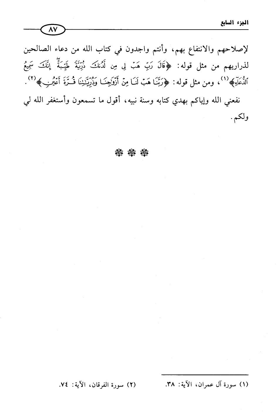 لإصلاحهم والانتفاع بهم، وأنتم واجدون في كتاب الله من دعاء الصالحين لذراريهم من مثل قوله: {قَالَ رَبِّ هَبْ لِي مِنْ لَدُنْكَ ذُرِّيَّةً طَيِّبَةً إِنَّكَ سَمِيعُ الدُّعَاءِ} (¬1)، ومن مثل قوله: {رَبَّنَا هَبْ لَنَا مِنْ أَزْوَاجِنَا وَذُرِّيَّاتِنَا قُرَّةَ أَعْيُنٍ} (¬2).