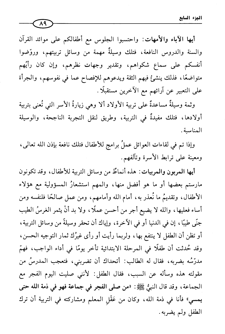 أيها الآباء والأمهات: واحتسبوا الجلوس مع أطفالكم على موائد القرآن والسنة والدروس النافعة، فتلك وسيلةٌ مهمة من وسائل تربيتهم، وروّضوا أنفسكم على سماع شكواهم، وتقدير وجهات نظرهم، وإن كان رأيُهم متواضعًا، فذلك ينشئُ فيهم الثقة ويدعوهم للإفصاح عما في نفوسهم، والجرأة على التعبير عن آرائهم مع الآخرين مستقبلًا.
