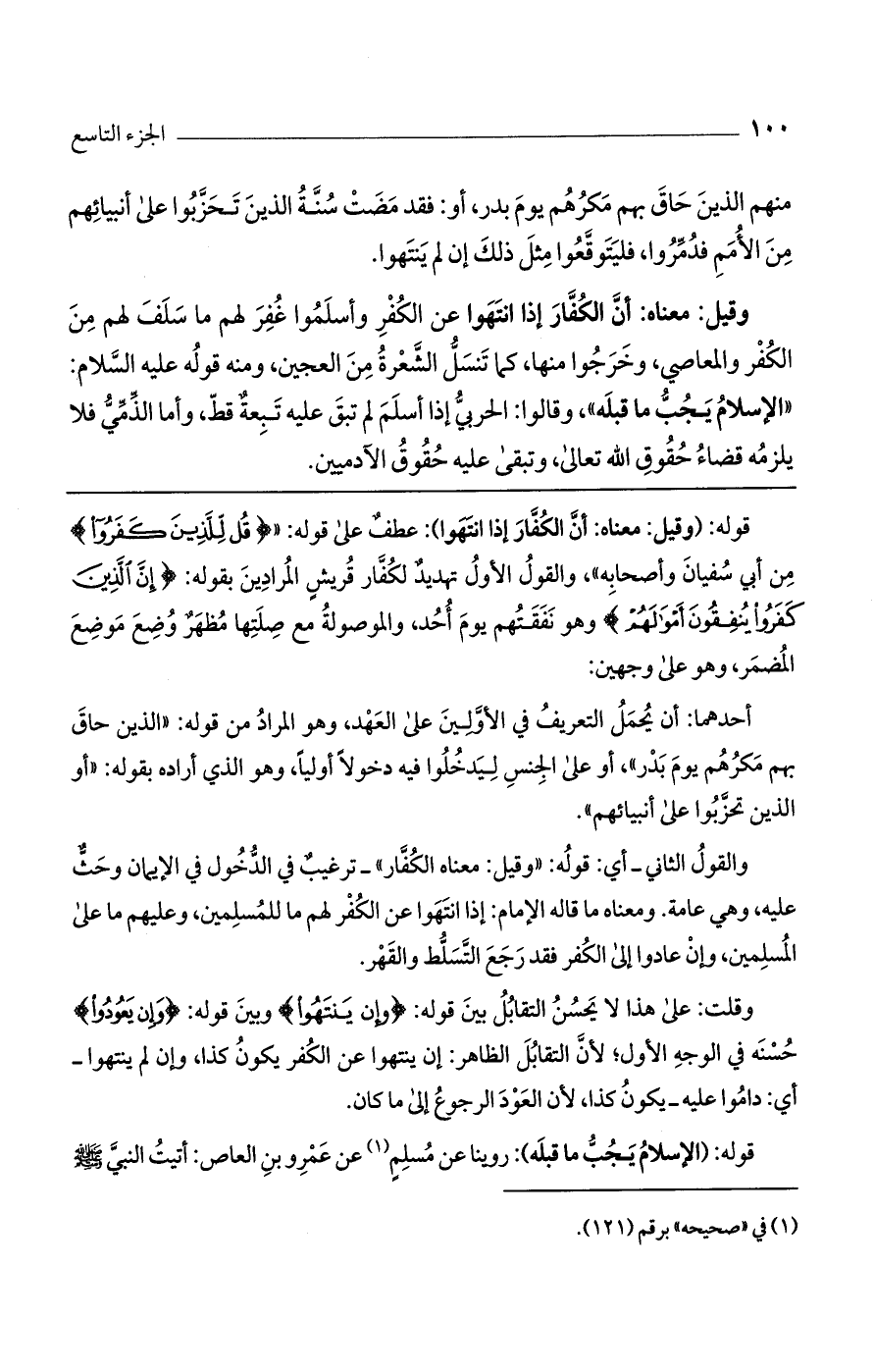 وقيل: معناه: أنّ الكفار إذا انتهوا عن الكفر وأسلموا غفر لهم ما قد سلف لهم من الكفر والمعاصي، وخرجوا منها، كما تنسلّ الشعرة من العجين، ومنه قوله عليه والسلام: "الإسلام يجب ما قبله"، وقالوا: الحربي إذا أسلم لم يبق عليه تبعة قط، وأما الذمي فلا يلزمه قضاء حقوق الله تعالى، وتبقى عليه حقوق الآدميين.
