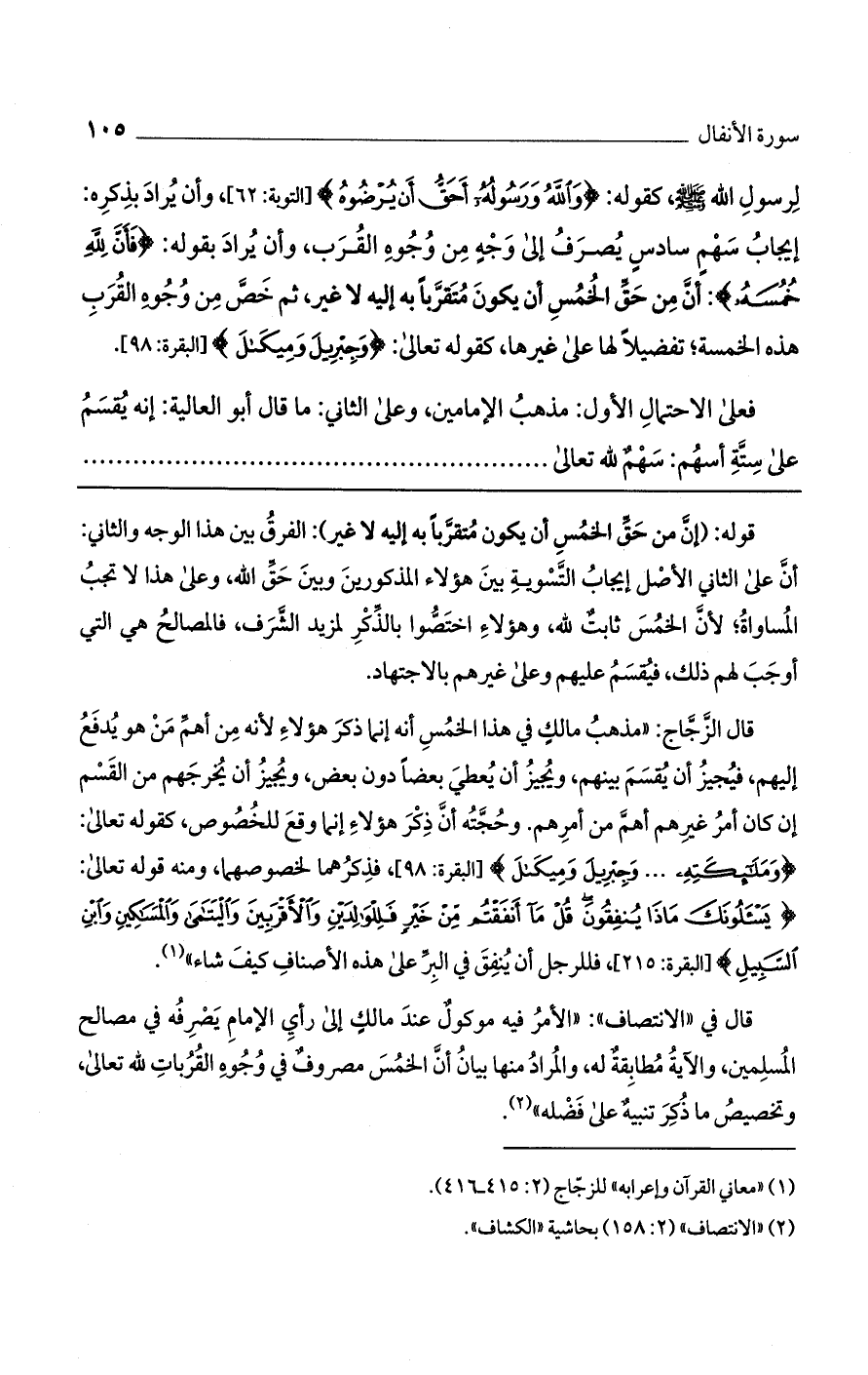 قال الزجاج: "مذهب مالك في هذا الخُمس أنه إنما ذكر هؤلاء لأنه من أهم من هو يدفع إليهم، فيجيز أن يُقسم بينهم، ويجيز أن يعطي بعضاً دون بعض، ويُجيز أن يخرجهم من القسم إن كان أمر غيرهم أهم من أمرهم. وحجته أن ذكر هؤلاء إنما وقع للخصوص، كقوله تعالى: (وَمَلائِكَتُهُ ... وَجِبْرِيلَ وَمِيكَالَ) [البقرة: 98]، فذكرهما لخصوصهما، ومنه قوله تعالى: (يَسْأَلُونَكَ مَاذَا يُنفِقُونَ قُلْ مَا أَنفَقْتُمْ مِنْ خَيْرٍ فَلِلْوَالِدَيْنِ وَالأَقْرَبِينَ وَالْيَتَامَى وَالْمَسَاكِينِ وَابْنِ السَّبِيلِ) [البقرة: 215]، فللرجل أن ينفق في البر على هذه الأصناف كيف شاء".