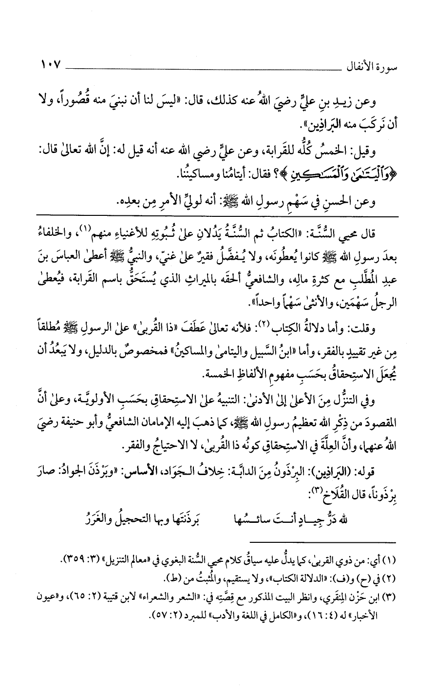 وقلت: وأما دلالة الكتاب: فلأنه تعالى عطف "ذا القربى" على الرسول صلى الله عليه وسلم مُطلقاً من غير تقييد بالفقر، وأما "ابن السبيل واليتامى والمساكين" فمخصوص بالدليل، ولا يبعد أن يُجعل الاستحقاق بحسب مفهوم الألفاظ الخمسة.