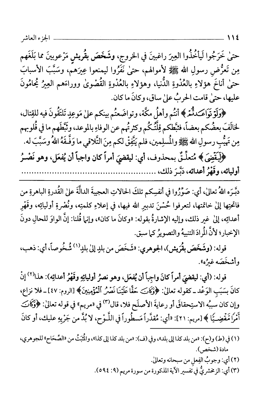 قوله: (أي: ليقضي أمراً كان واجباً أن يُفعل، وهو نصر أوليائه وقهر أعدائه): هذا إن كان بسبب الوعد - كقوله تعالى: (وَكَانَ حَقّاً عَلَيْنَا نَصْرُ الْمُؤْمِنِينَ) [الروم: 47]- فلا نزاع، وإن كان سببه الاستحقاق أو رعاية الأصلح فلا، قال في "مريم" في قوله تعالى: (وَكَانَ أَمْراً مَقْضِيّاً) [مريم: 21]: "أي: مقدراً مسطوراً في اللوح، لابد من جريه عليك، أو كان