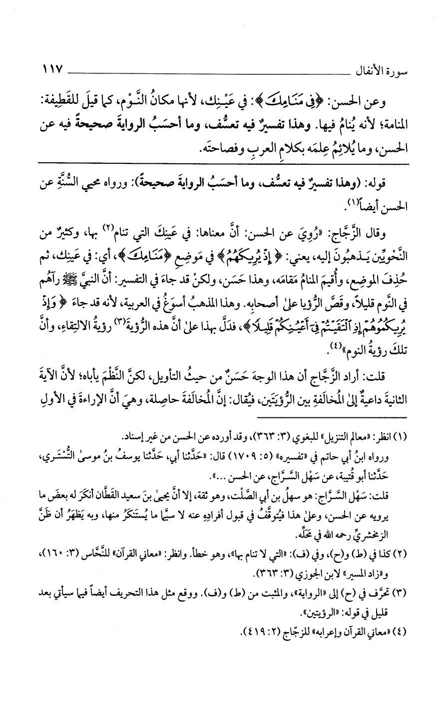وقال الزجاج: "رُوي عن الحسن: أن معناها: فيعينك التي تنام بها، وكثير من النحويين يذهبون إليه، يعني: (إِذْ يُرِيكَهُمْ) في موضع (مَنَامِكَ)، أي: في عينك، ثم حُذف الموضع، وأقيم المنام مقامه، وهذا حسن، ولكن قد جاء في التفسير: أن النبي صلى الله عليه وسلم رآهم في النوم قليلاً، وقص الرؤيا على أصحابه. وهذا المذهب أسوغ في العربية، لأنه قد جاء (وَإِذْ يُرِيكُمُوهُمْ إِذْ الْتَقَيْتُمْ فِي أَعْيُنِكُمْ قَلِيلاً)، فدل بهذا على أن هذه الرؤية رؤية الالتقاء، وأن تلك رؤية النوم".