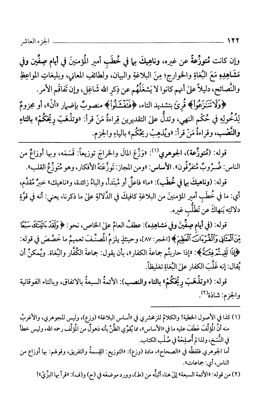 وإن كانت متوزعة عن غيره، وناهيك بما في خطب أمير المؤمنين في أيام صفين وفي مشاهده مع البغاة والخوارج؛ من البلاغة والبيان، ولطائف المعاني وبليغات المواعظ والنصائح، دليلا على أنهم كانوا لا يشغلهم عن ذكر الله شاغل وإن تفاقم الأمر.